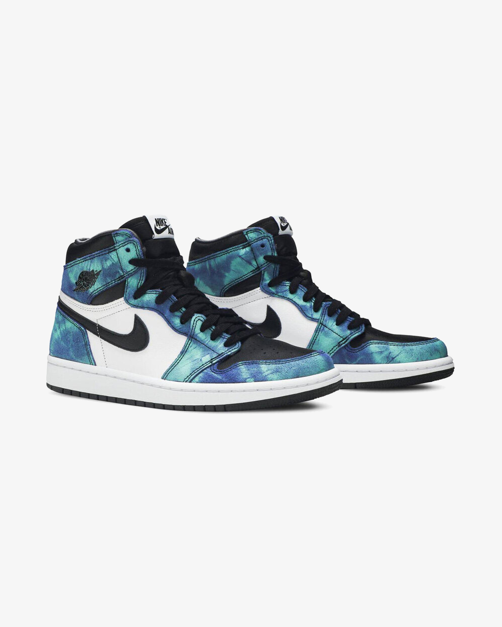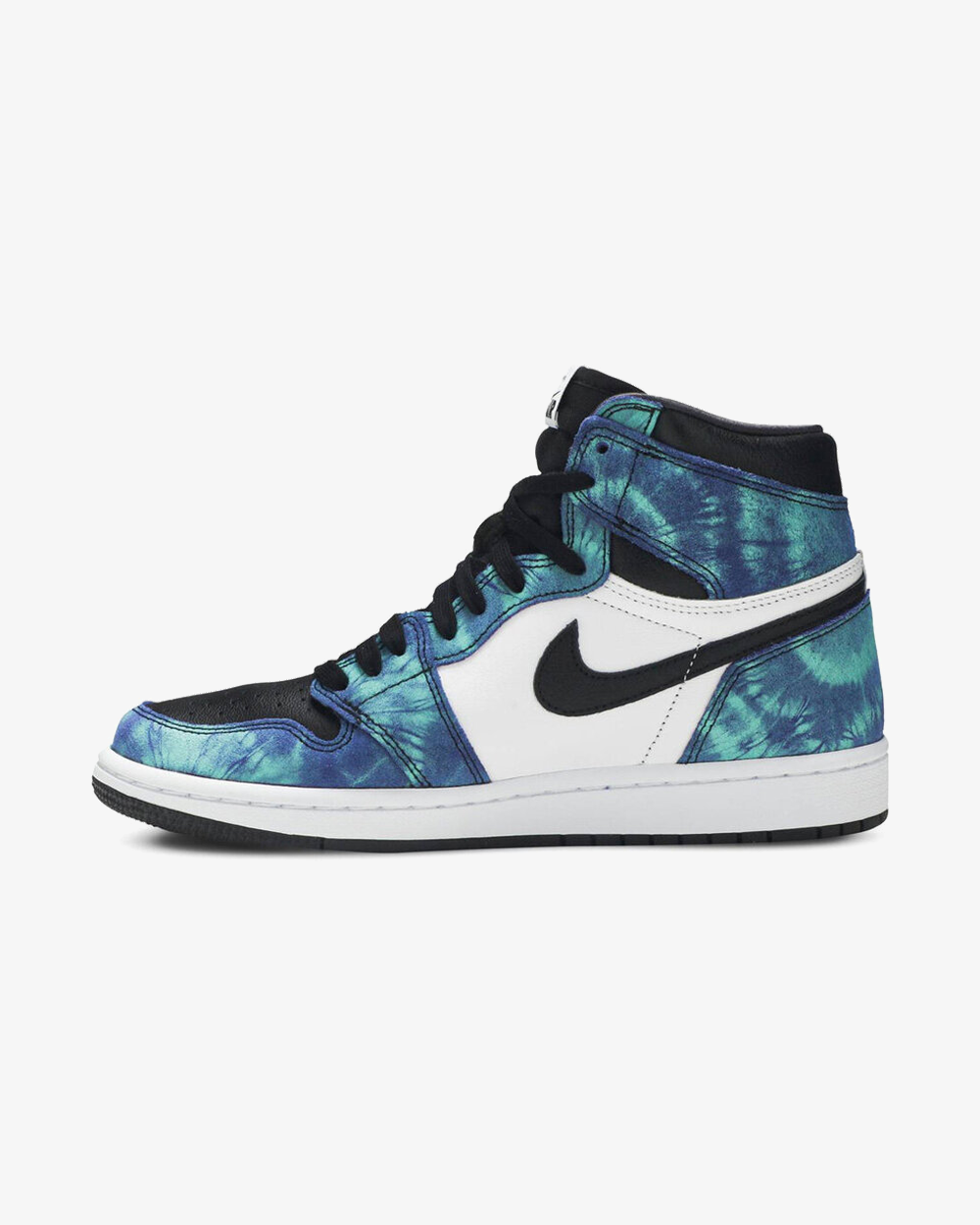 The Jordan 1 Retro High Tie Dye (W) consists of a white and black leather upper with blue and green tie-dye print leather overlays. A black Swoosh, white midsole, and black outsole complete the design. This Jordan 1 Tie Dye released in June of 2020