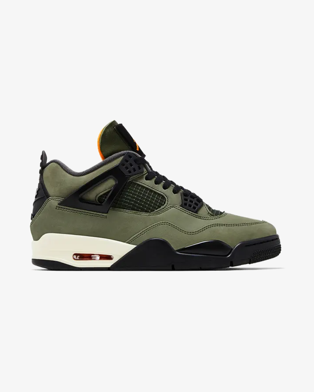 The 2025 reissue of the Undefeated x Air Jordan 4 brings back the highly coveted collaboration that initially dropped in 2005 in a limited run of 72 pairs. Inspired by an MA-1 flight jacket, the classic silhouette sports an olive green nubuck upper with contrasting black accents on the molded eyelets, TPU supports wings, and back tab, marked with a Nike Air logo. Velcro logo patches adorn the tongue, lined with vibrant orange textile on the interior side. The sneaker rests on an off-white polyurethane midsole with a visible orange-tinged Air unit in the heel.