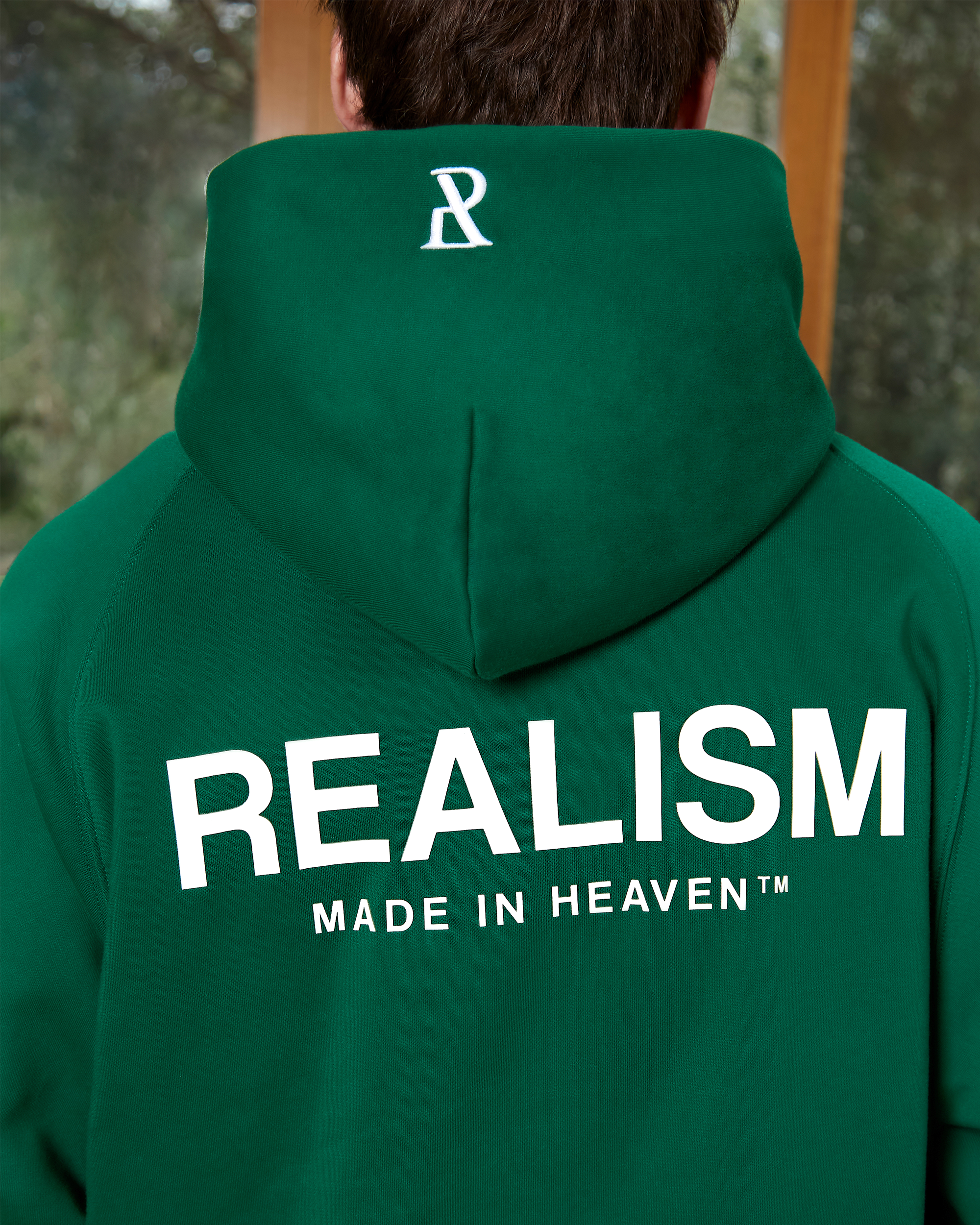 The ultimate hoodie. Premium, comfortable, and designed with purpose. Featuring Realism's signature 350 gsm fleece crafted into a raglan, oversized silhouette, this hoodie is accentuated with 3-dimensional silicone applique logos on the front and back. An embroidered "R" logo on the hood and a "Made in Heaven" motif on the right sleeve complete this iconic design.
