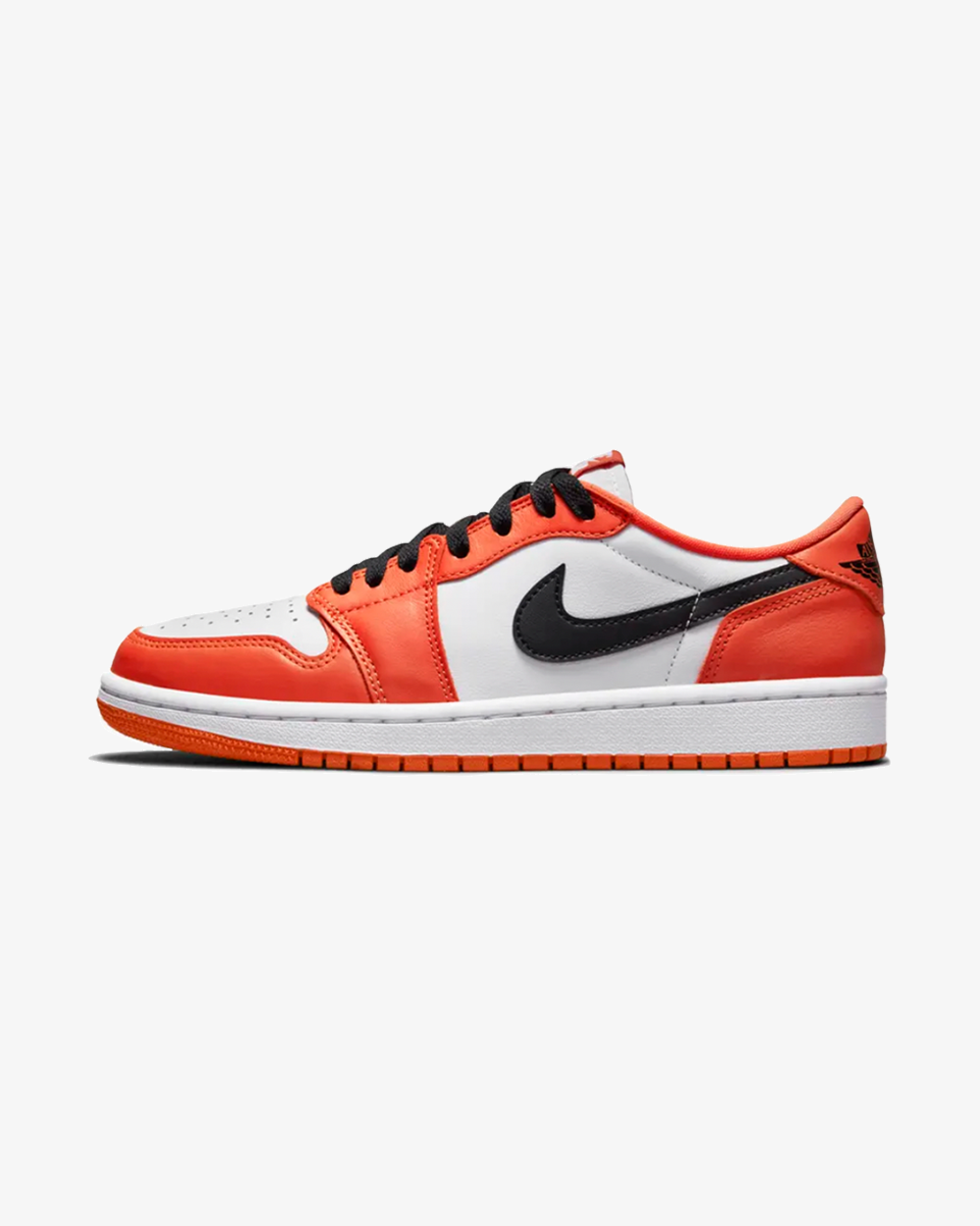 The Air Jordan 1 Low OG ‘Starfish’ features a familiar colour combination that recalls the brand’s ‘Shattered Backboard’ series. The low-top carries an all-leather upper that pairs a crisp white base with contrasting orange overlays at the forefoot, heel and eyestay. Contrasting black hits land on the Swoosh, laces and Jordan Wings logo stamped on the heel tab. Nike Air branding decorates the sockliner and woven tongue tag. The sneaker is mounted on a rubber cupsole with encapsulated Air sole cushioning in the heel.
