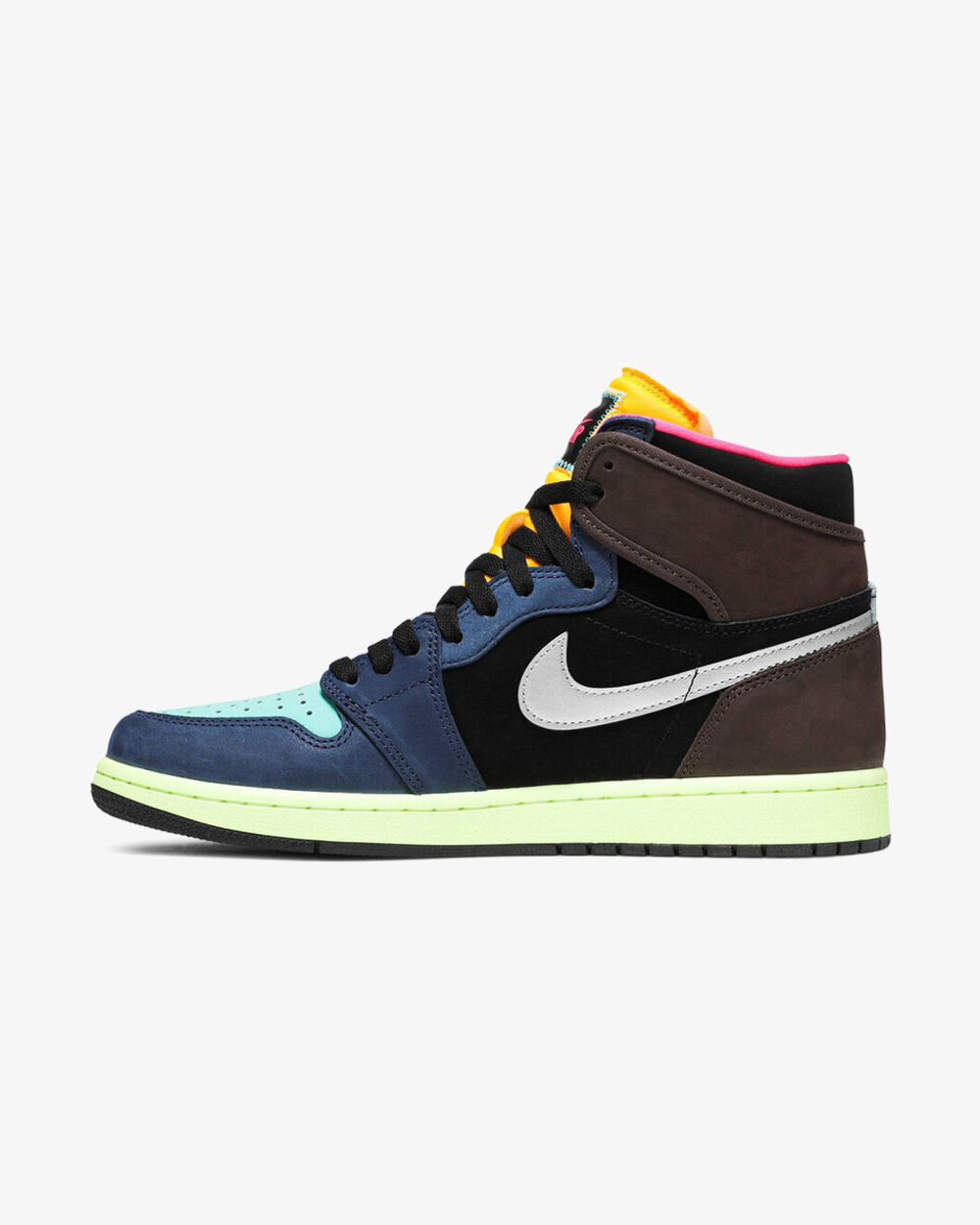 Inspired by Japan’s capital city, the Air Jordan 1 Retro High ‘Tokyo Bio Hack’ features color blocking that recalls Undefeated’s Nike Dunk High NL collaboration from 2005. The leather and suede upper brings together an eclectic mix of colors, including rustic earth tones, eye-catching vibrant hues and a lone pop of metallic silver on the signature Swoosh. A painted midsole combines with a stitched Nike tag atop the exposed foam tongue for a unique DIY aesthetic.