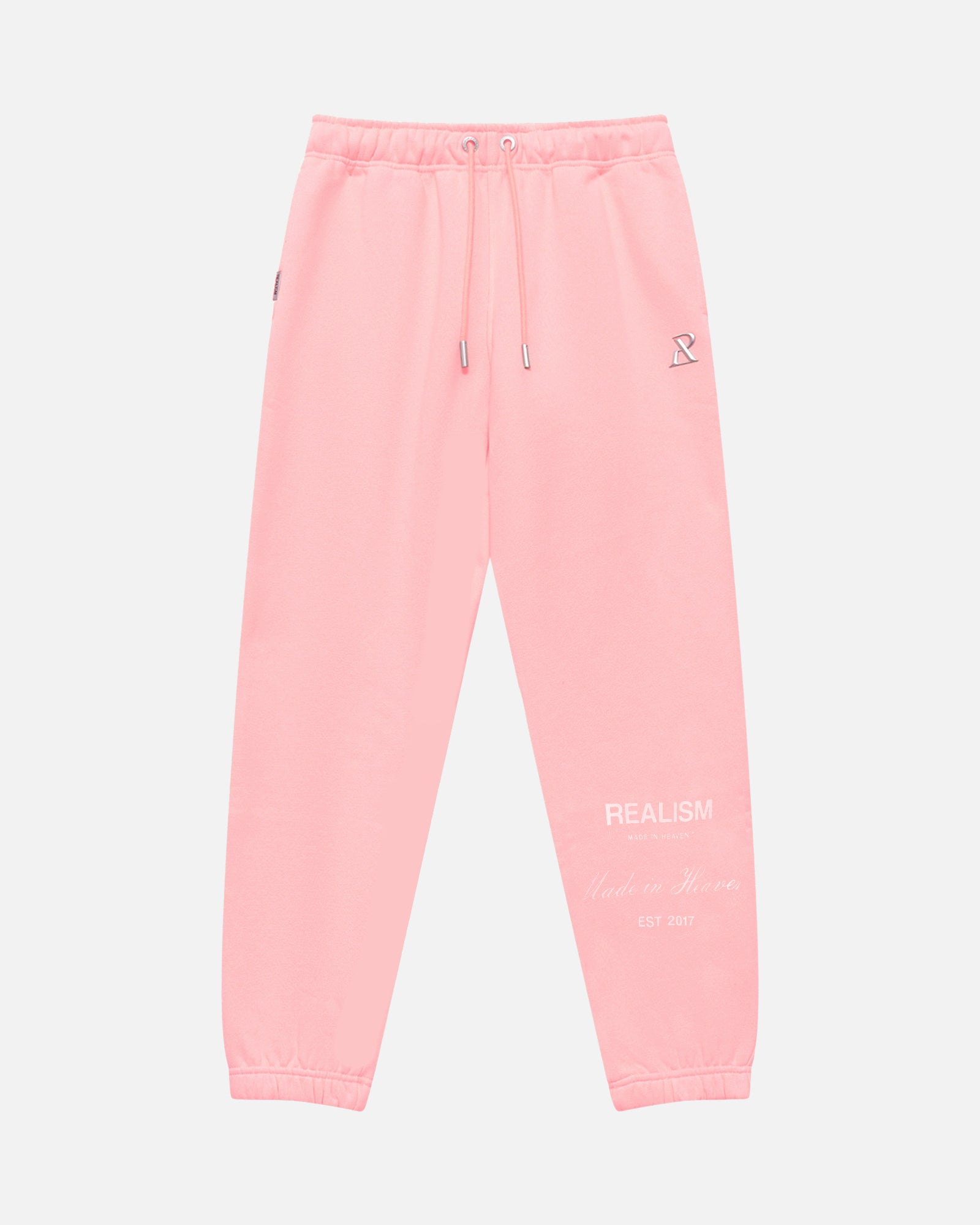 This classic silhouette is refreshed with a deluxe signature from the Realism Radiant collection. Made with Realism's signature comfy fleece in a relaxed Pink Dust guise, this sweatpant features metal accents including custom "R" branded drawstring openings & aglets, thigh emblem and tag. An embroidered "R" on the back pocket and shin print ties together a design that captures the essence of premium loungewear.