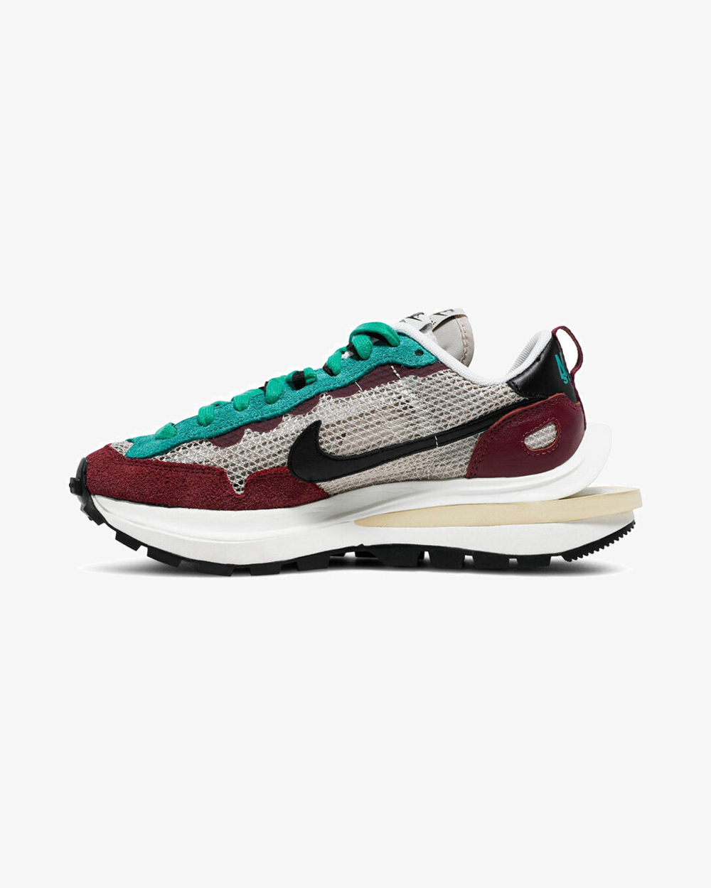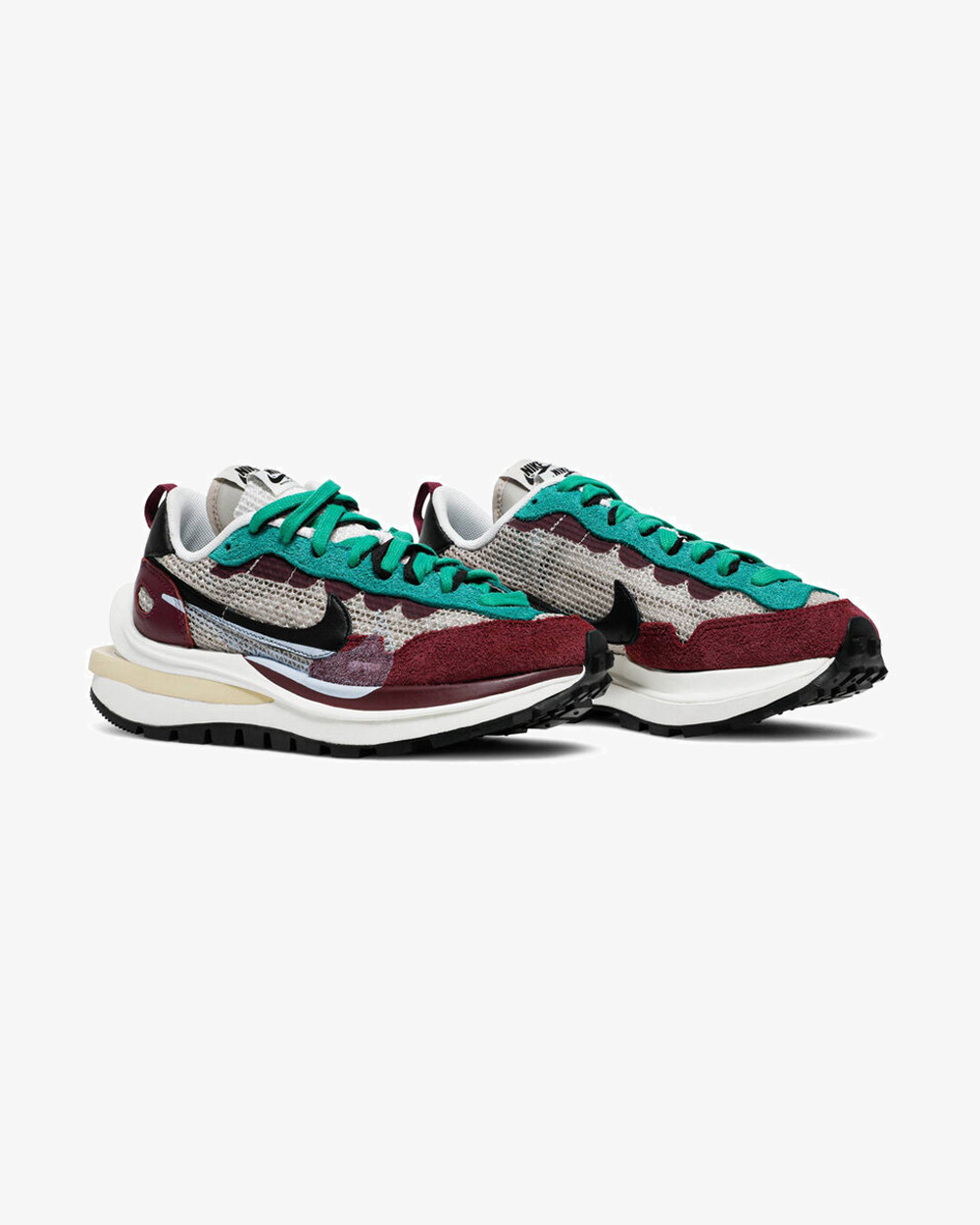 The upper of the Nike Vaporwaffle sacai Villain Red Neptune Green is constructed with mesh and leather, with burgundy and green suede overlays. Similar to previous models, the Vaporwaffle borrows from the Swoosh’s original Waffle sole and adds an avante-garde flair with a thicker, stacked midsole that peeks out from the heel. Just like past Nike collaborations, sacai doubles up on the sneaker’s Swoosh and tongue, continuing the layered motif.