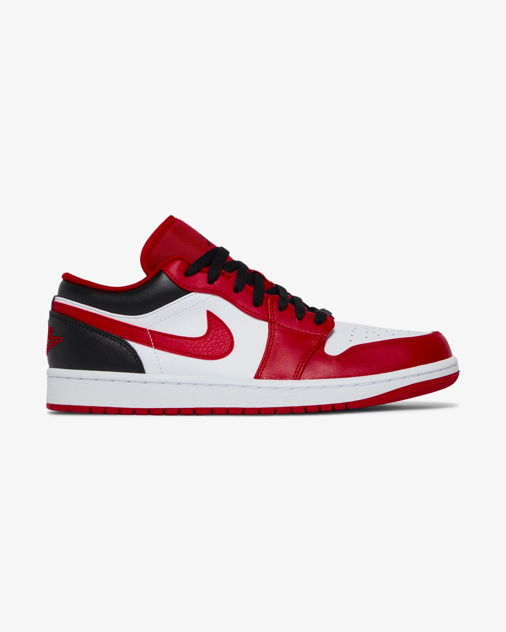 The Jordan 1 Low Bulls is constructed in the full leather, featuring mesh tounges and lining. The shoe has a crisp, white base with red and black overlays. The crimson Swoosh sits atop the white midsole while the rubber outsole matches the branding in color.