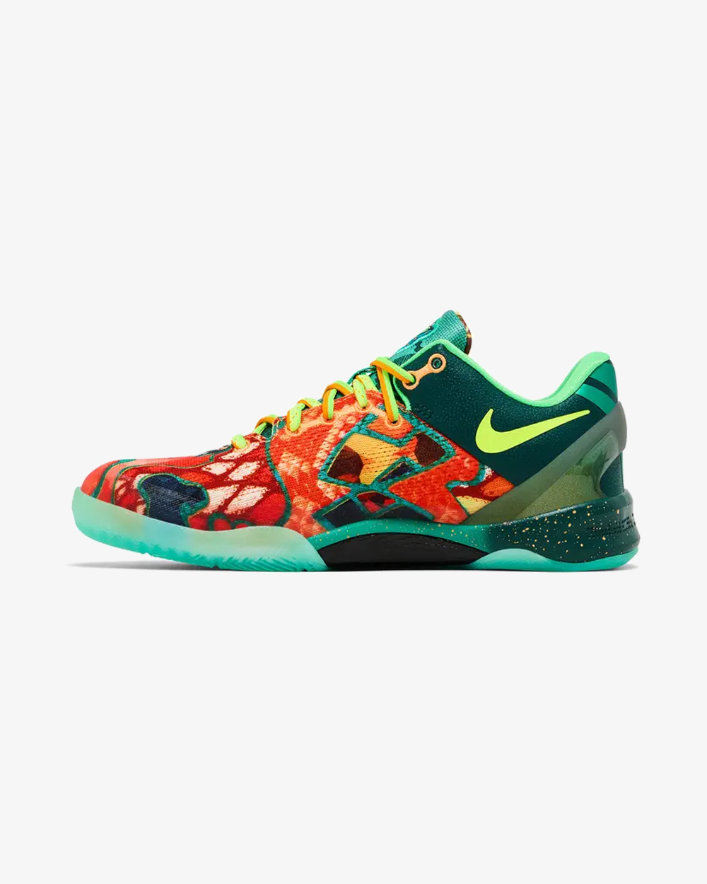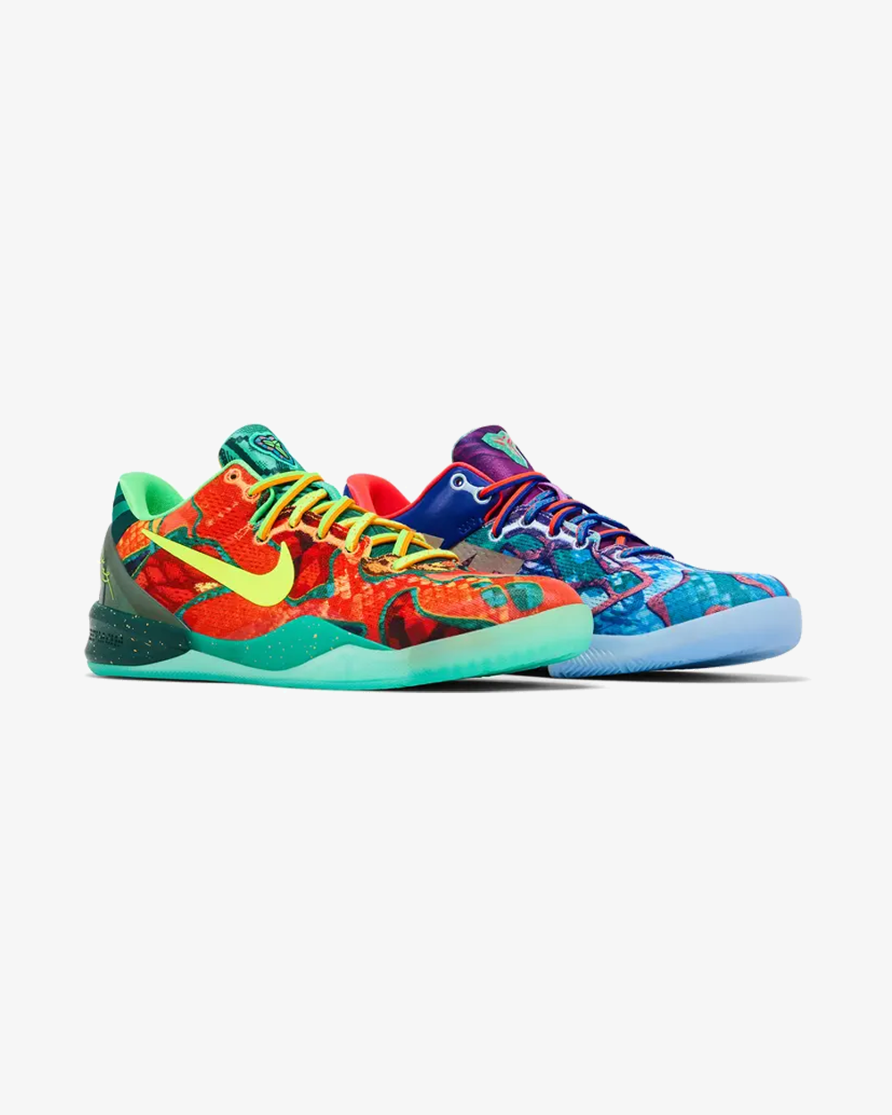 Elevate your sneaker rotation with the Nike Kobe 8 Protro GS ‘What The Kobe’ (2025)—a bold, mismatched masterpiece designed to commemorate Kobe Bryant’s legacy in unrivaled style. A kaleidoscopic fusion—one of each pair features nearly 30 colorways from the Kobe 8 archive Right Shoe: Electric Orange mesh upper, Volt Swoosh, glow‑in‑the‑dark accents, translucent green‑speckled outsole/midsole. Left Shoe: Deep Night/blue tones, bright orange Swoosh, oversized reflective “NIKE” branding on the medial side, purple‑to‑blue gradient midsole, clear outsole