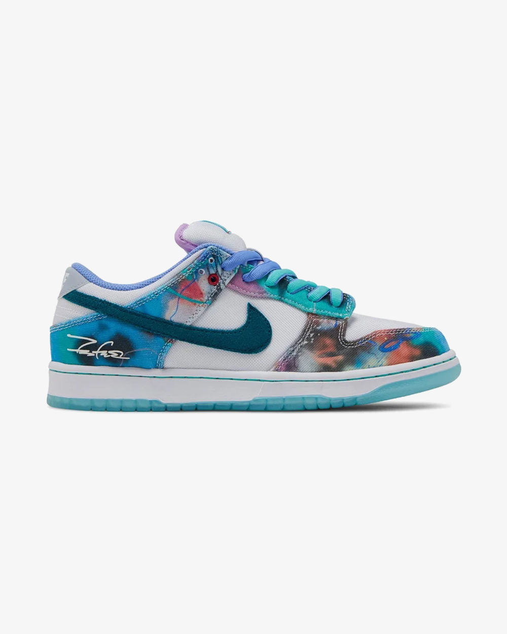 The Futura Laboratories x Nike Dunk Low SB 'Bleached Aqua' features a suede Swoosh in a dark teal finish on the white canvas upper, fortified with multicolor canvas overlays covered in Futura's abstract artwork. The artist's signature is inscribed on the lateral heel, while the FL logo appears on the medial side. A co-branded woven tag graces the stuffed tongue. Underfoot, a blue-tinged translucent rubber outsole provides grippy traction.