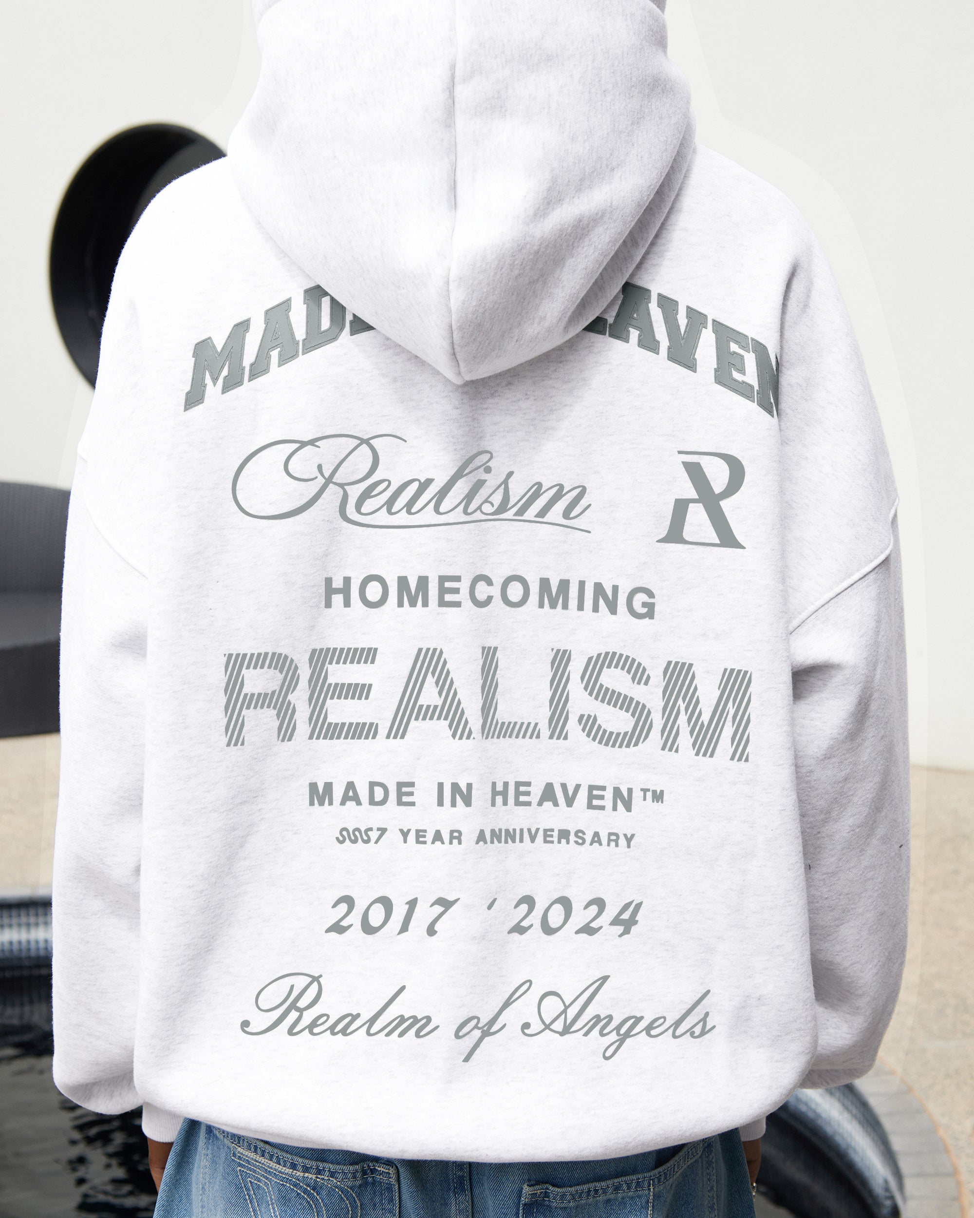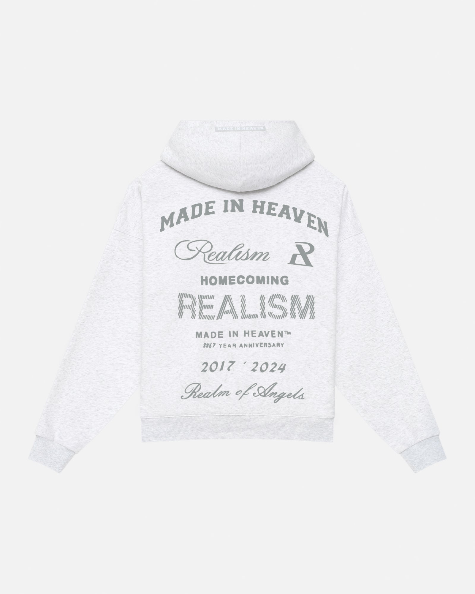 Refreshed with a deluxe signature from the Homecoming Collection. Crafted from Realism’s signature 350gsm fleece in a timeless Snow Marle guise, this oversized hoodie features a custom “R” branded zip and detailed anniversary graphics that commemorate the Realism journey from 2017 to 2024.