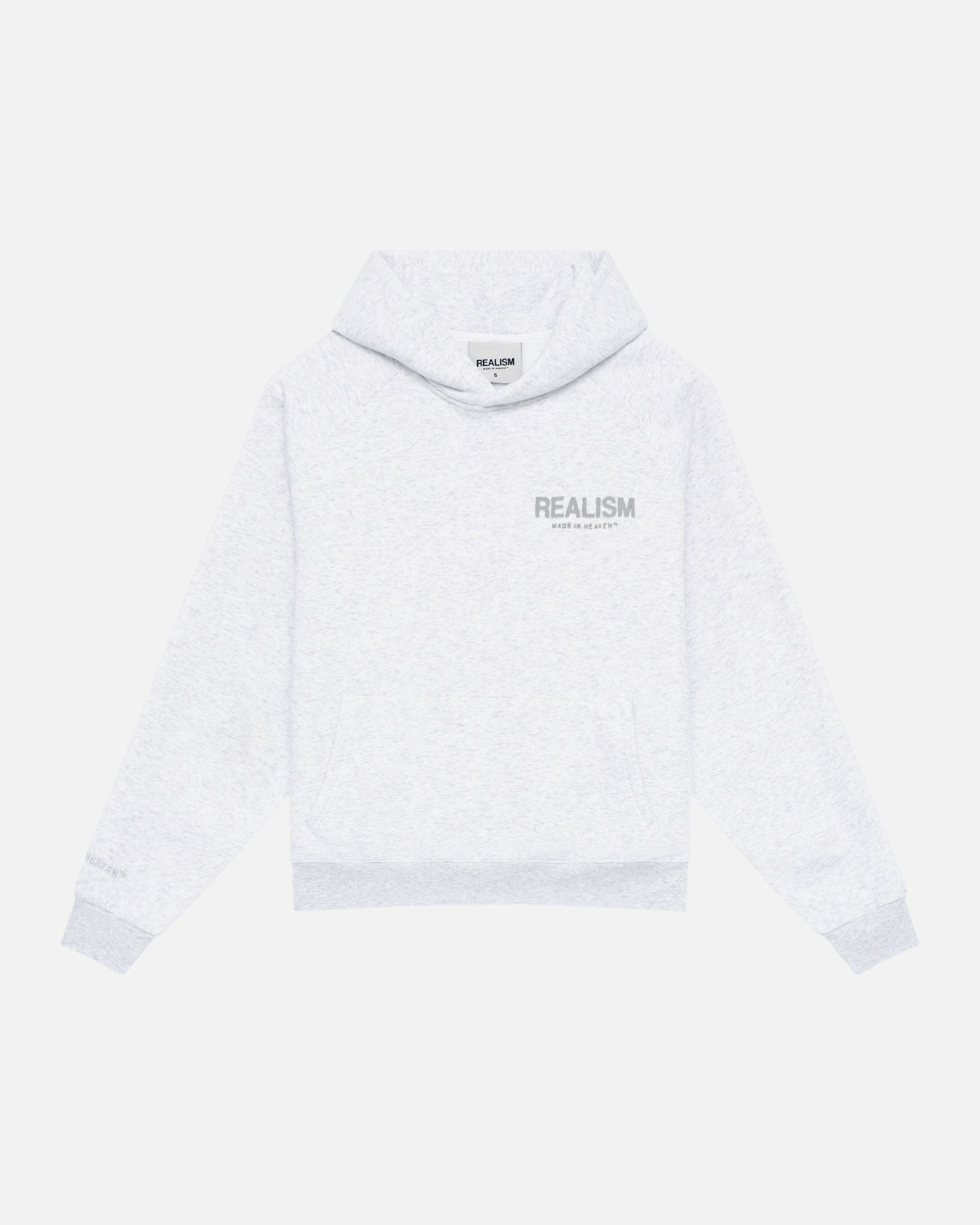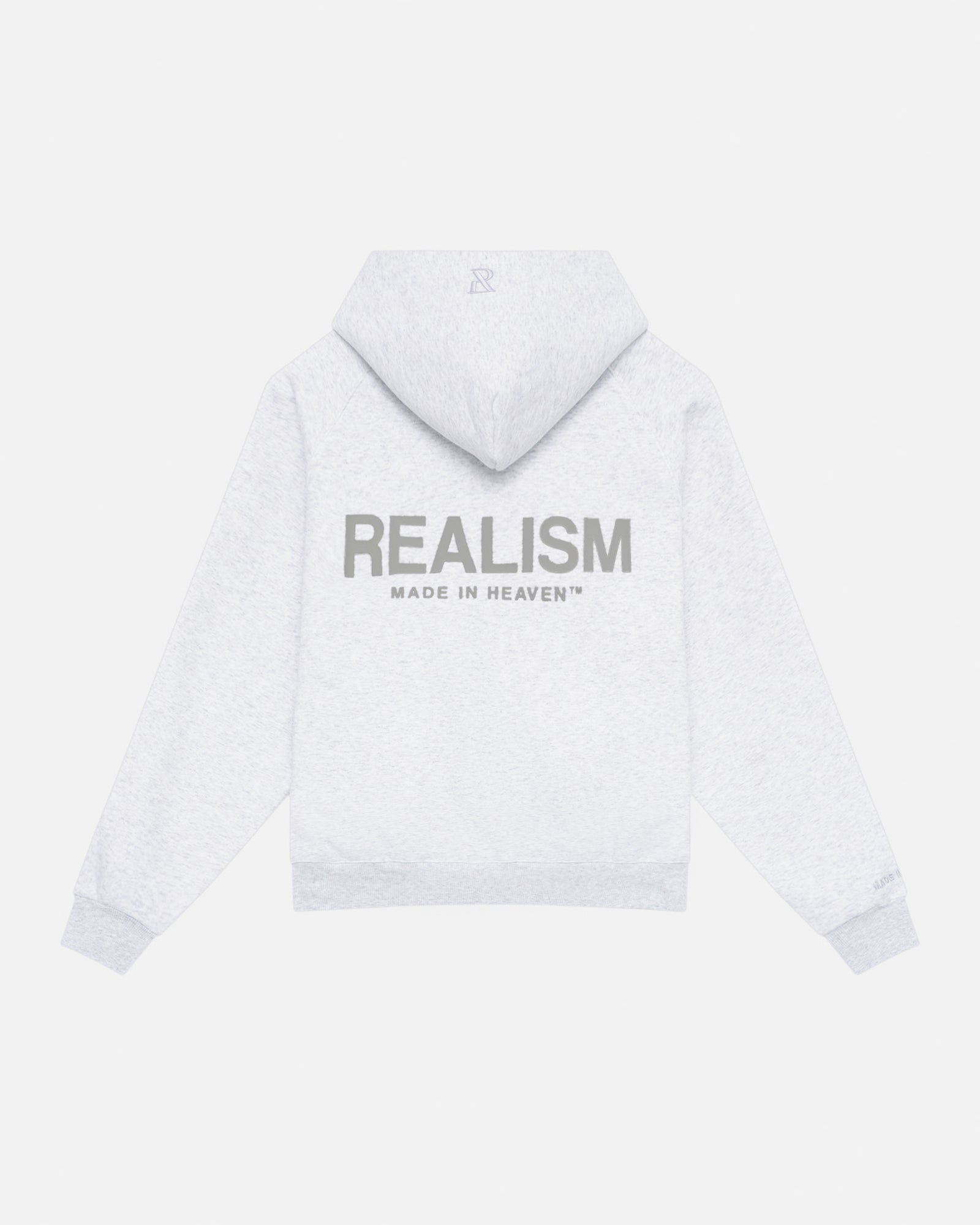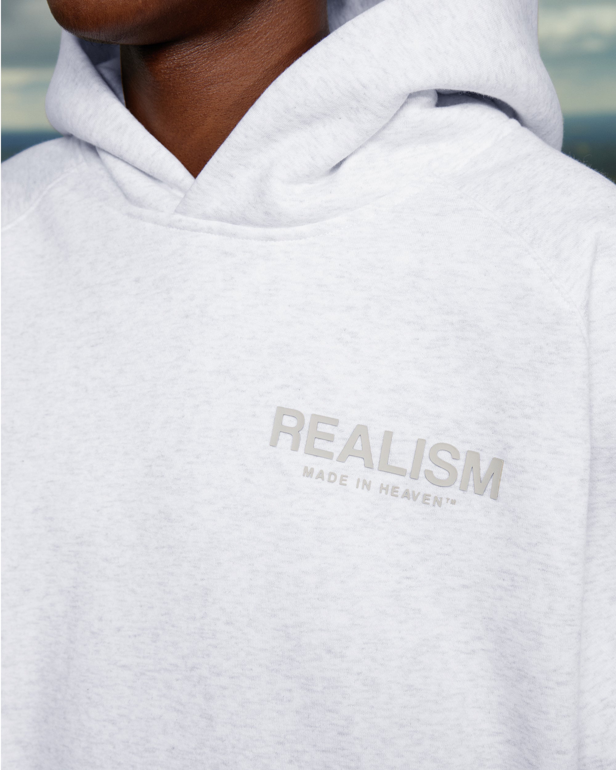The ultimate hoodie. Premium, comfortable, and designed with purpose. Featuring Realism's signature 350 gsm fleece crafted into a raglan, oversized silhouette, this hoodie is accentuated with 3-dimensional silicone applique logos on the front and back. An embroidered "R" logo on the hood and a "Made in Heaven" motif on the right sleeve complete this iconic design.