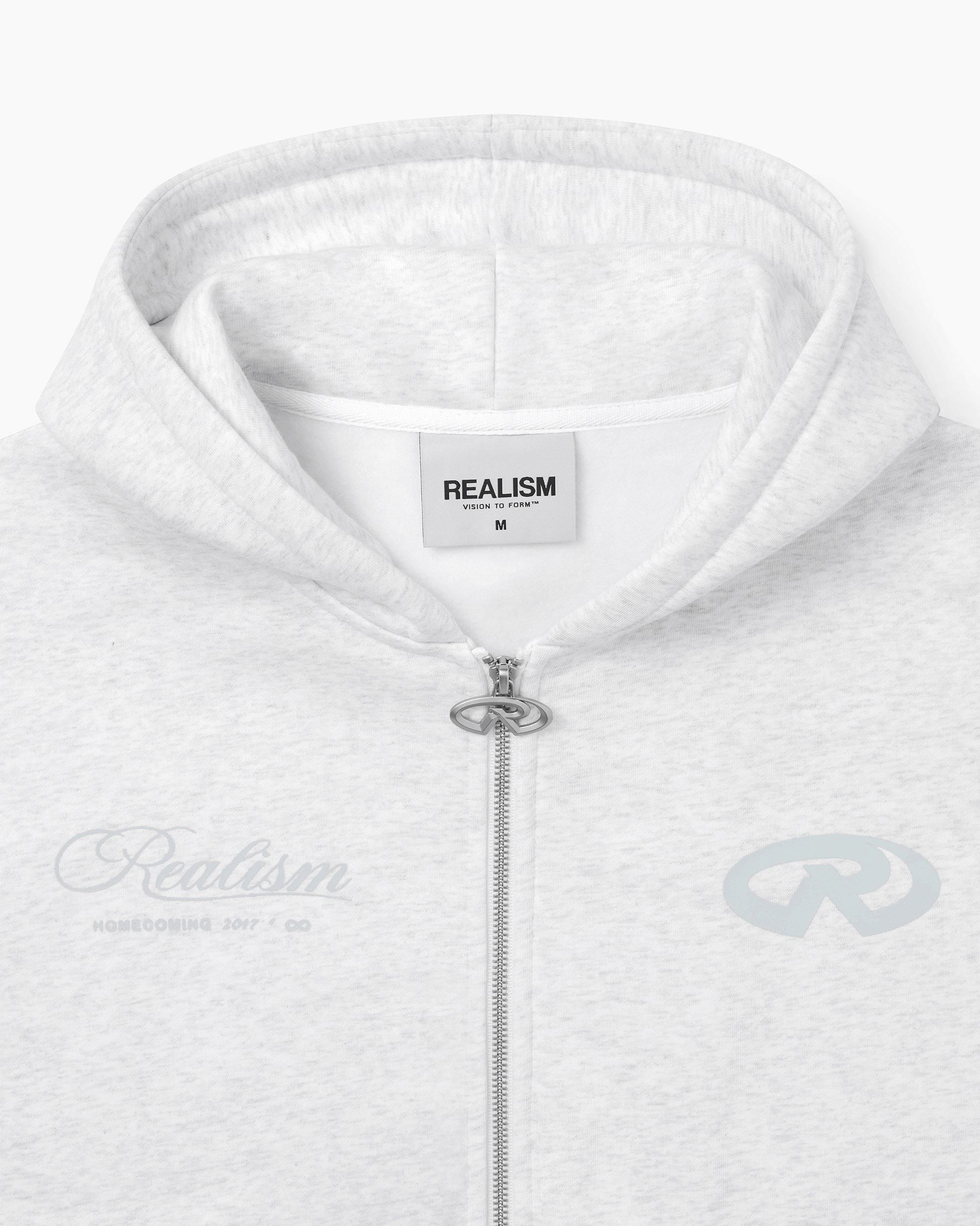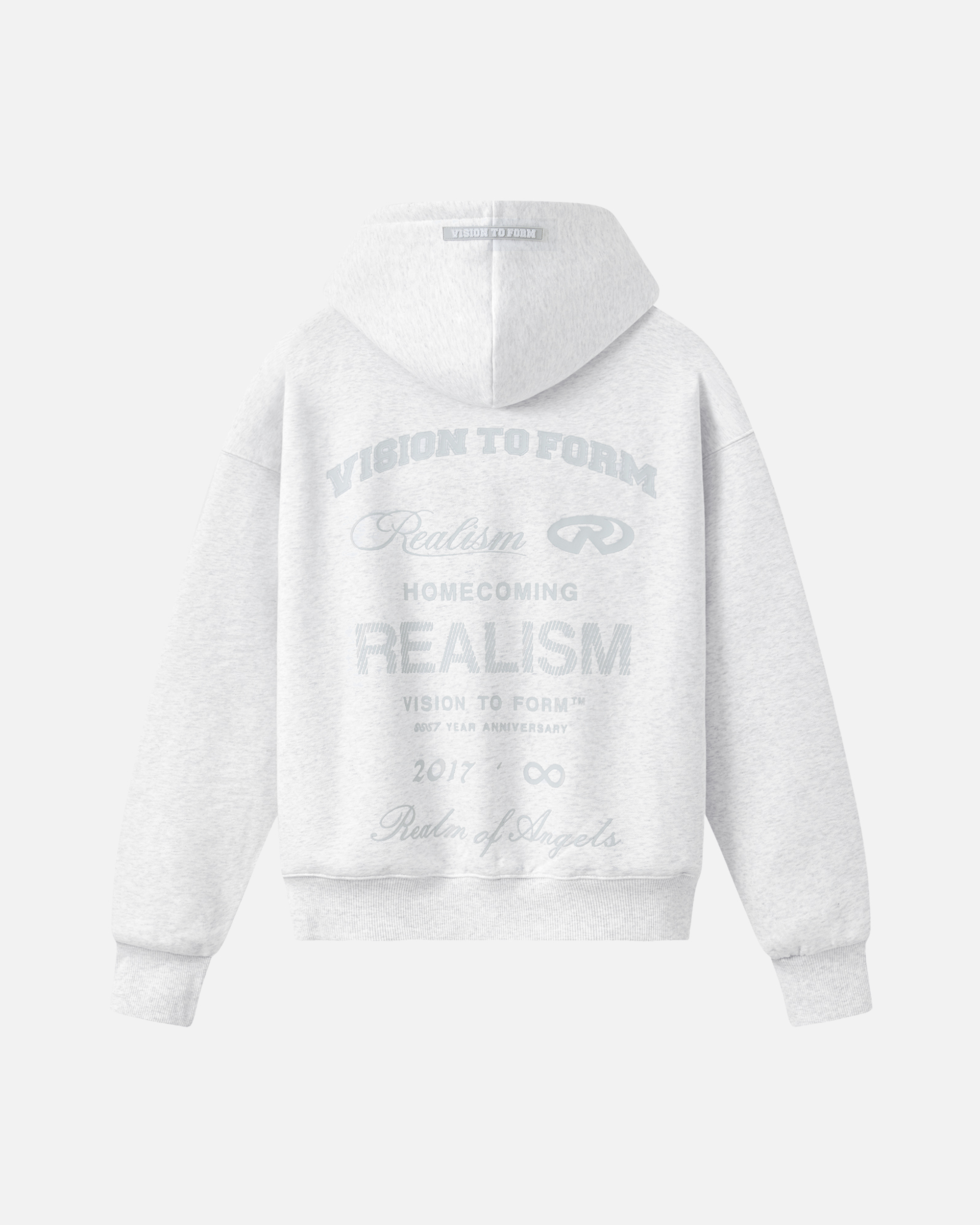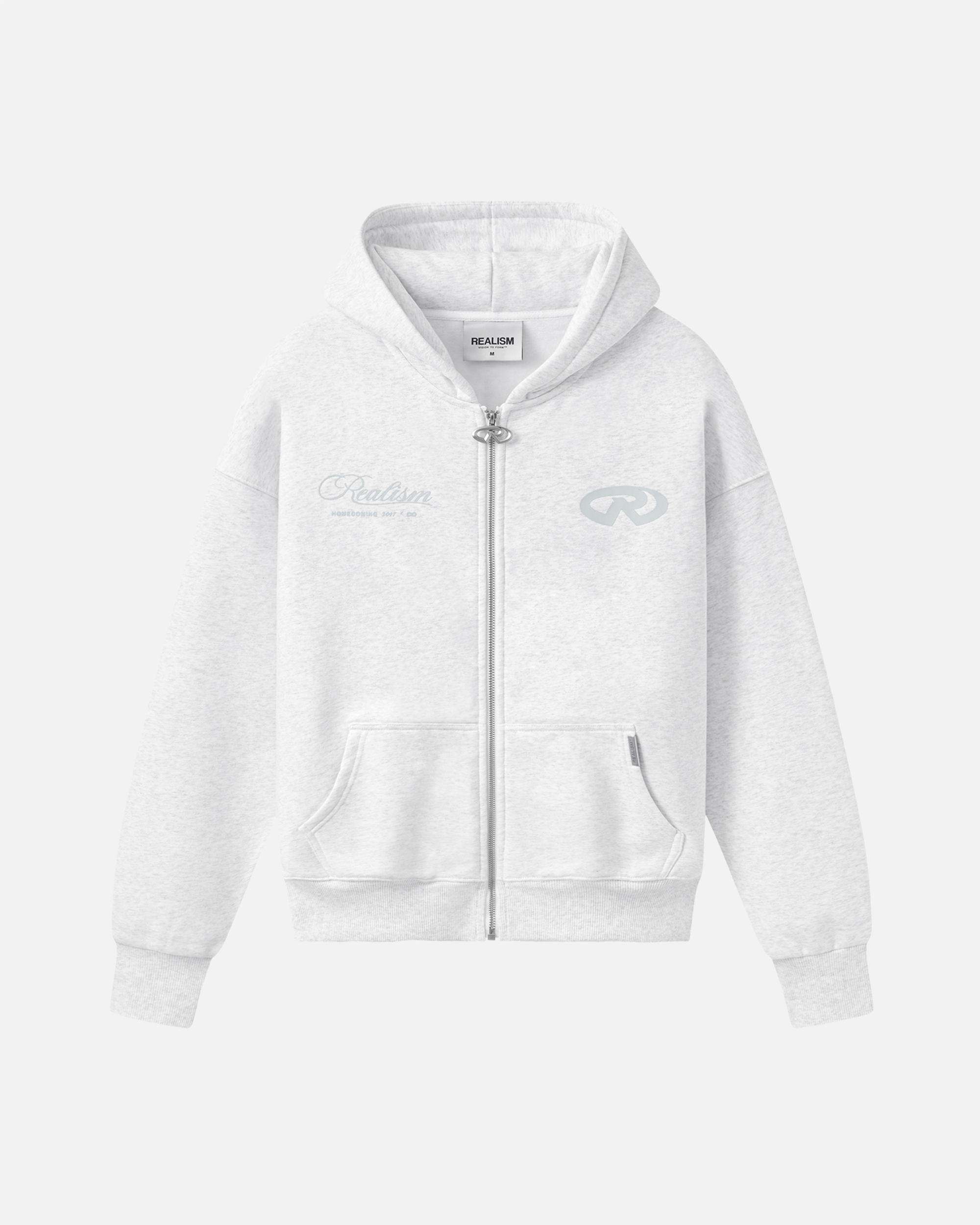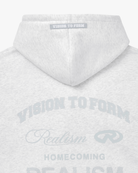 Refreshed with a deluxe signature from the Homecoming Collection. Crafted from Realism’s signature 410 GSM fleece in a timeless Snow Marle guise, this oversized hoodie features a custom “R” branded zip and detailed anniversary graphics that commemorate the Realism journey from 2017 to 2024.