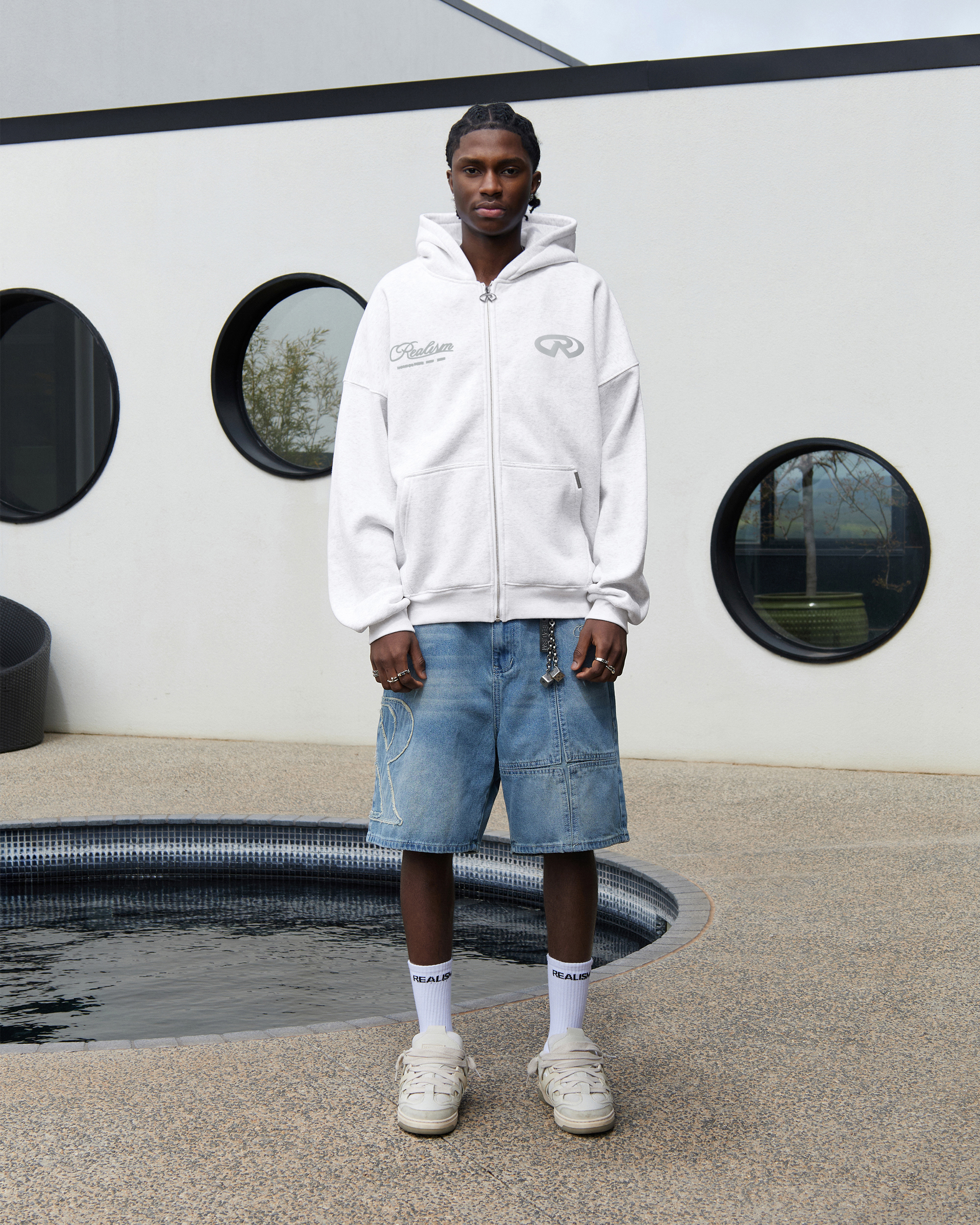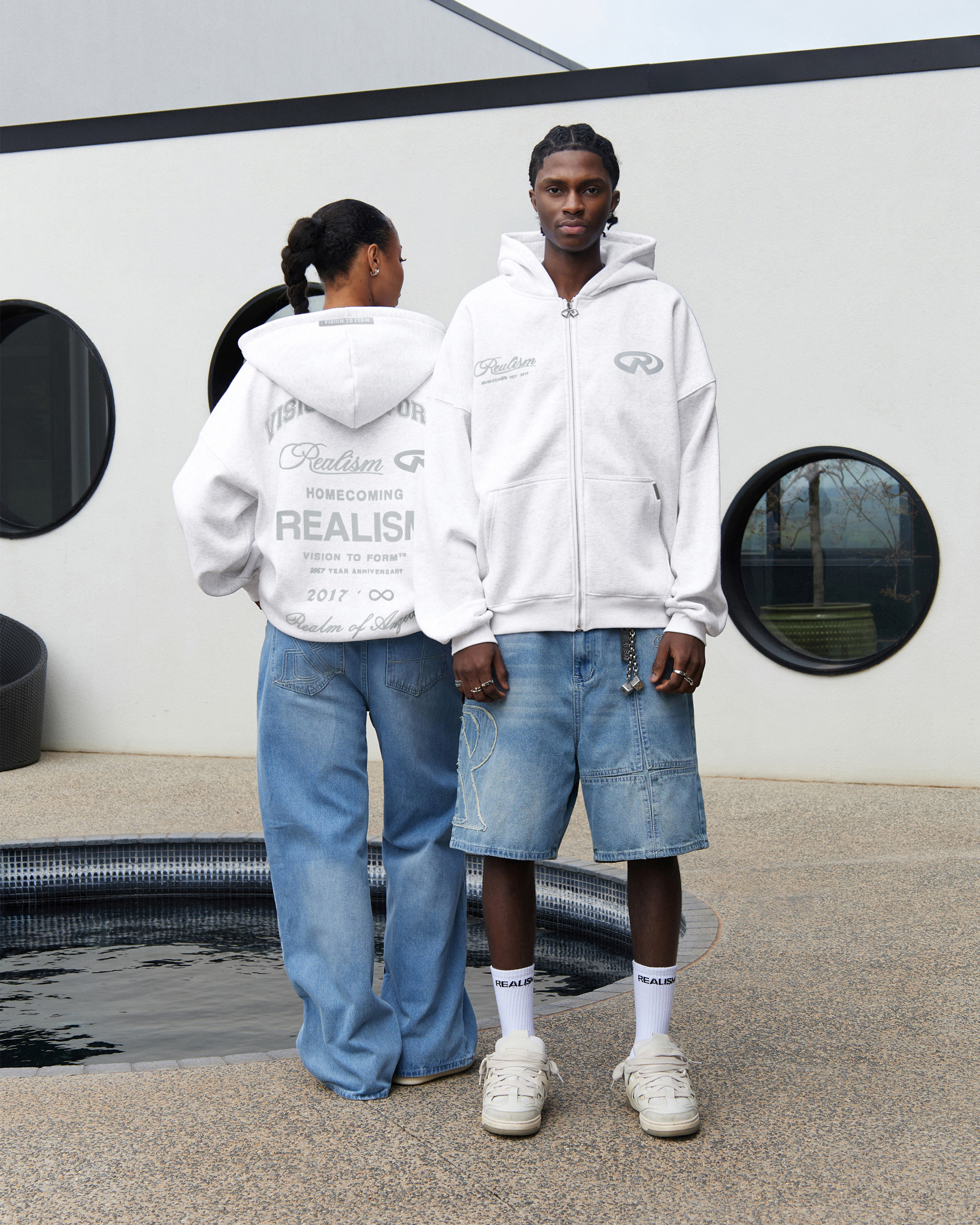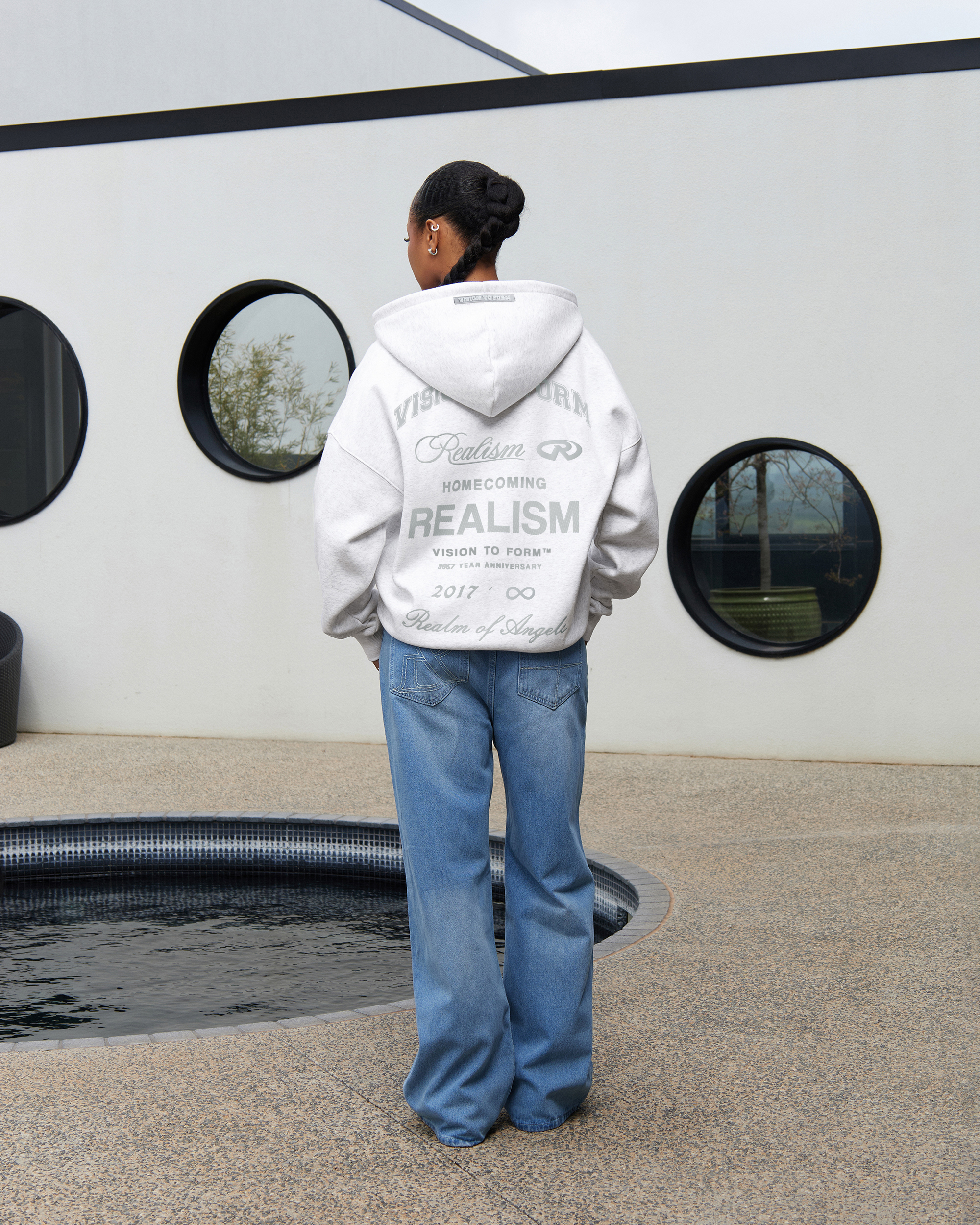Refreshed with a deluxe signature from the Homecoming Collection. Crafted from Realism’s signature 410 GSM fleece in a timeless Snow Marle guise, this oversized hoodie features a custom “R” branded zip and detailed anniversary graphics that commemorate the Realism journey from 2017 to 2024.
