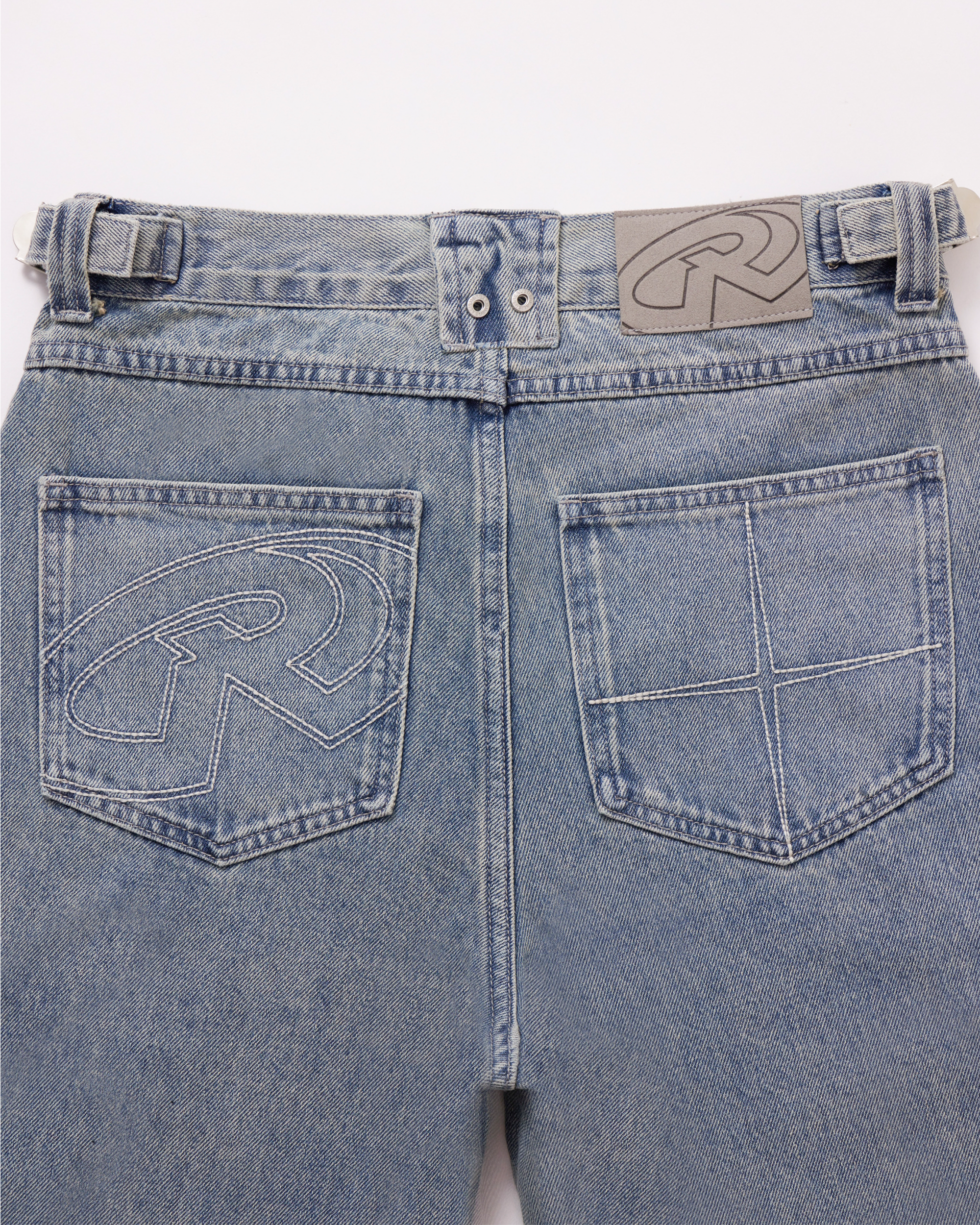 - Angled back pockets with custom double stitched "R" and Star embroidery