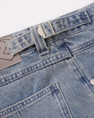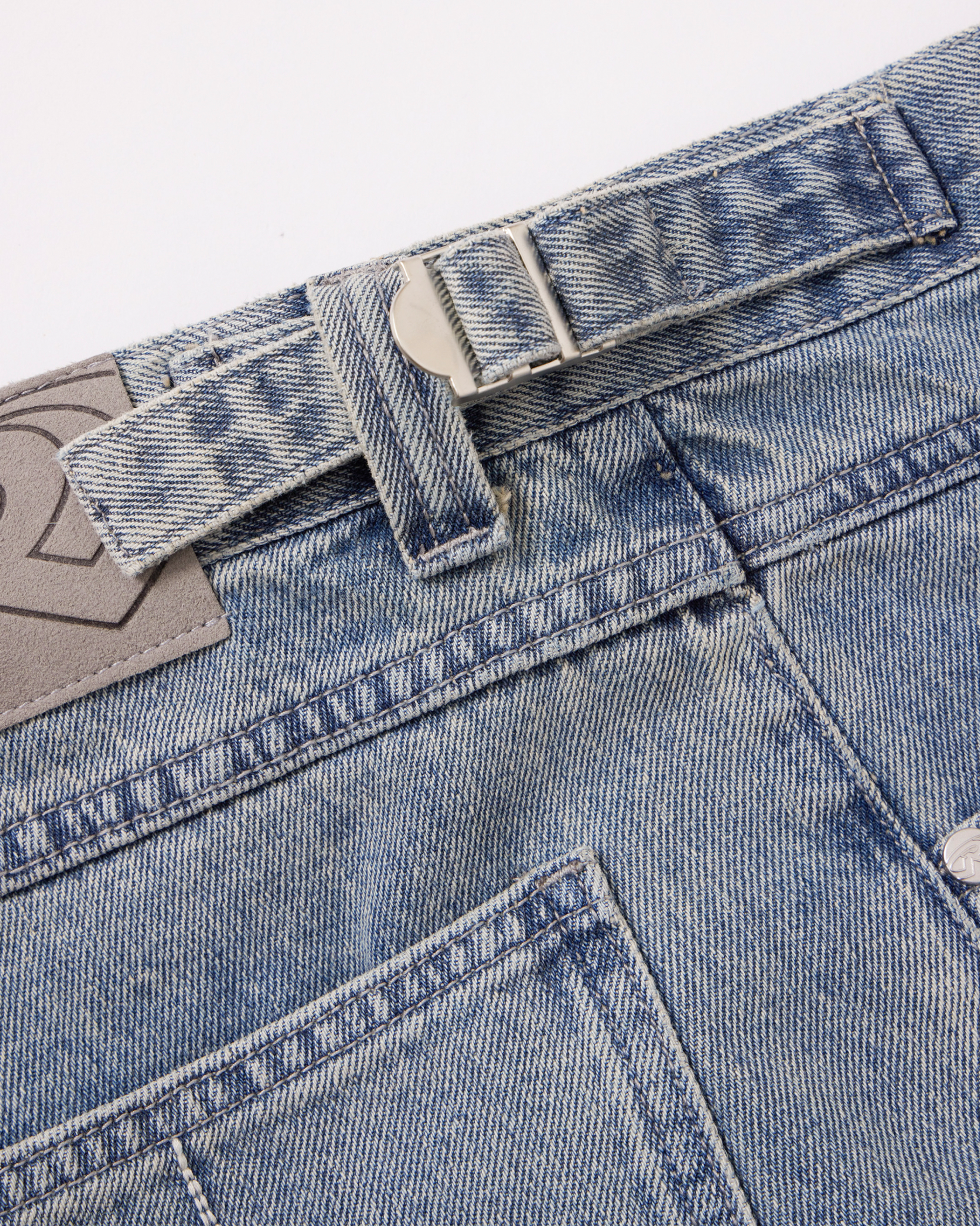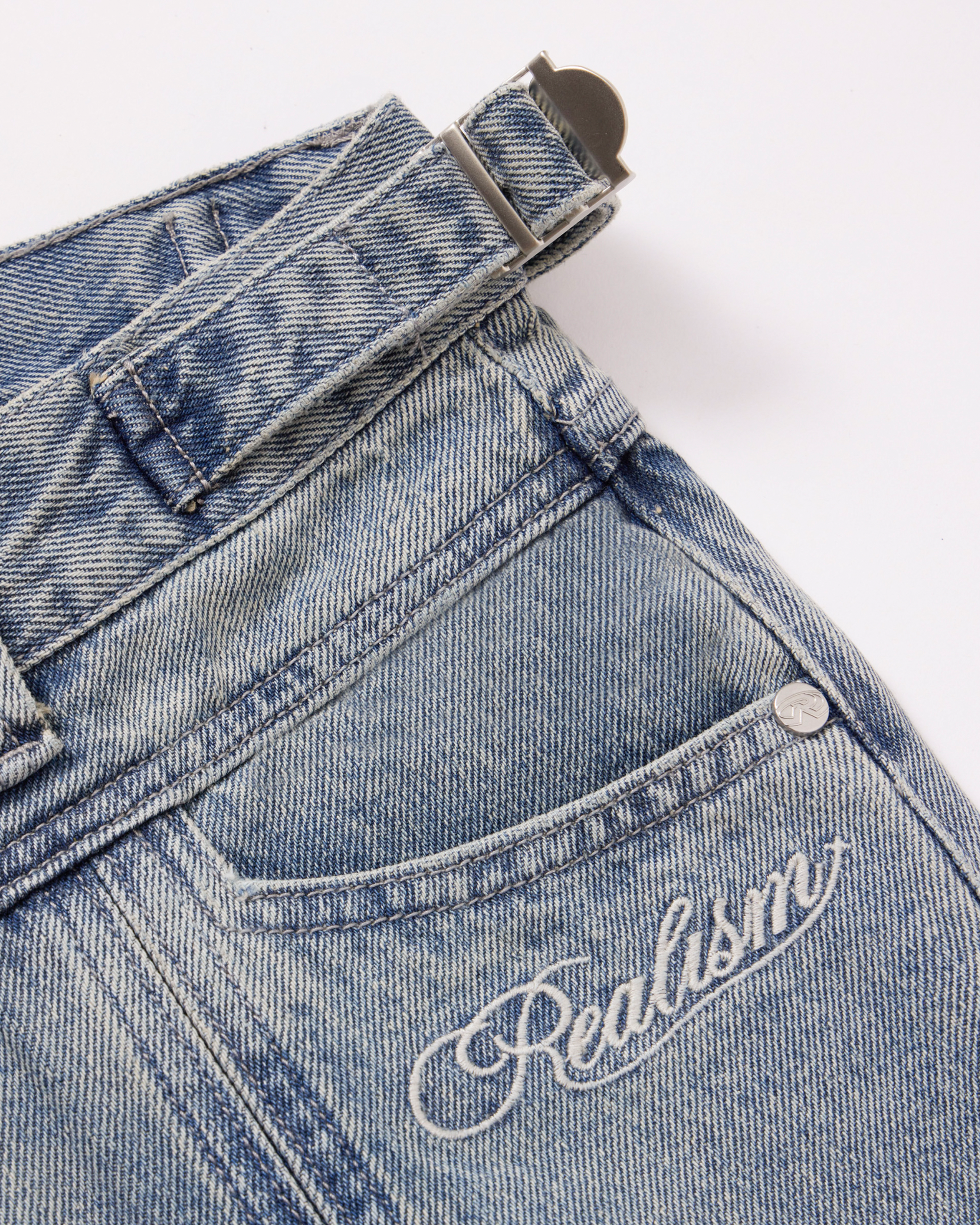 - Custom embossed metallic button accents on belt loops