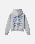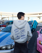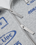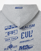 The R-Line Zip Hoodie in Grey Marle explores layered branding through a technical, collage-style layout. Featuring a mix of REALISM marks and sub-label graphics across the front and back, this piece is balanced with tyre mark graphics running down both sleeves, referencing motion and movement.