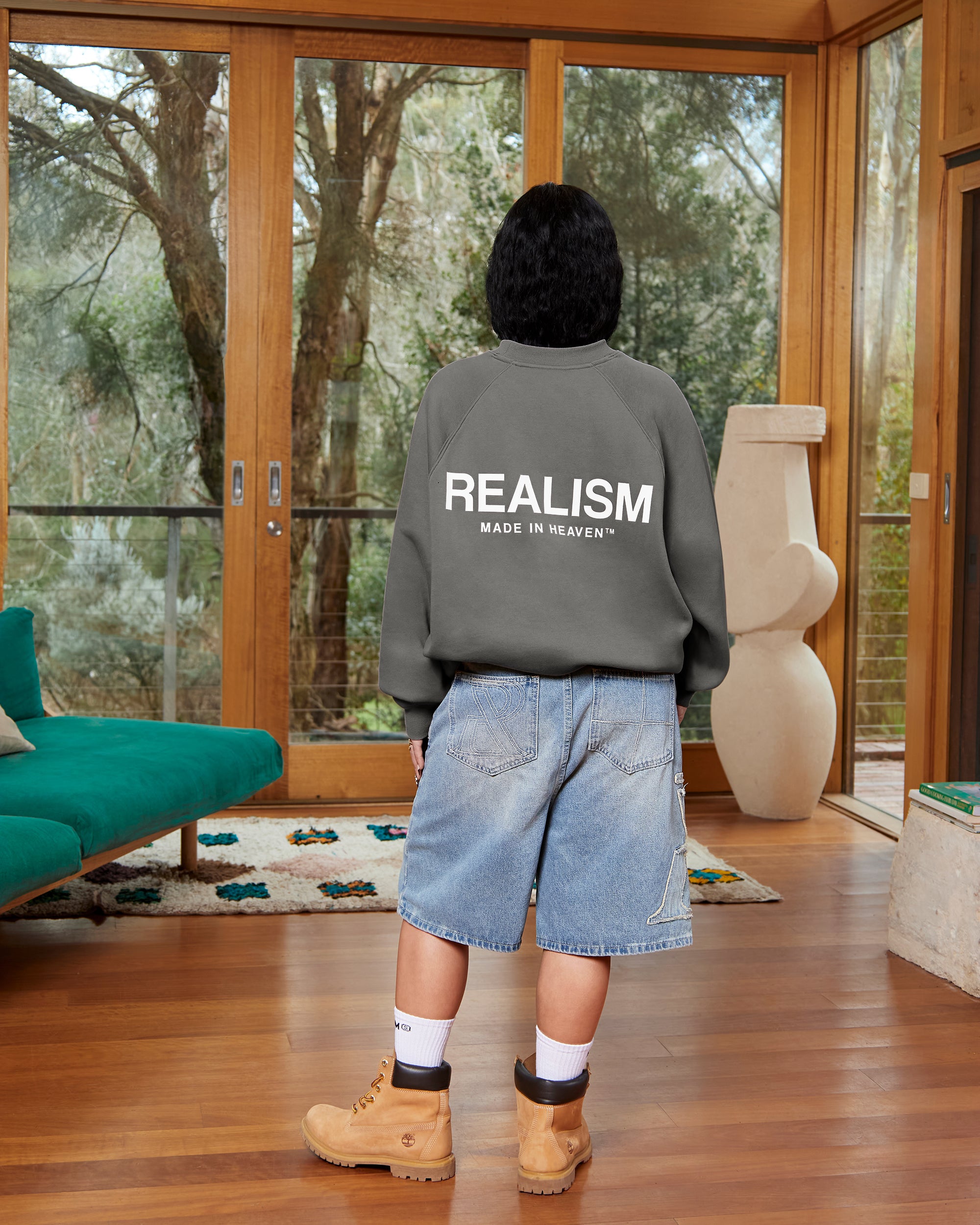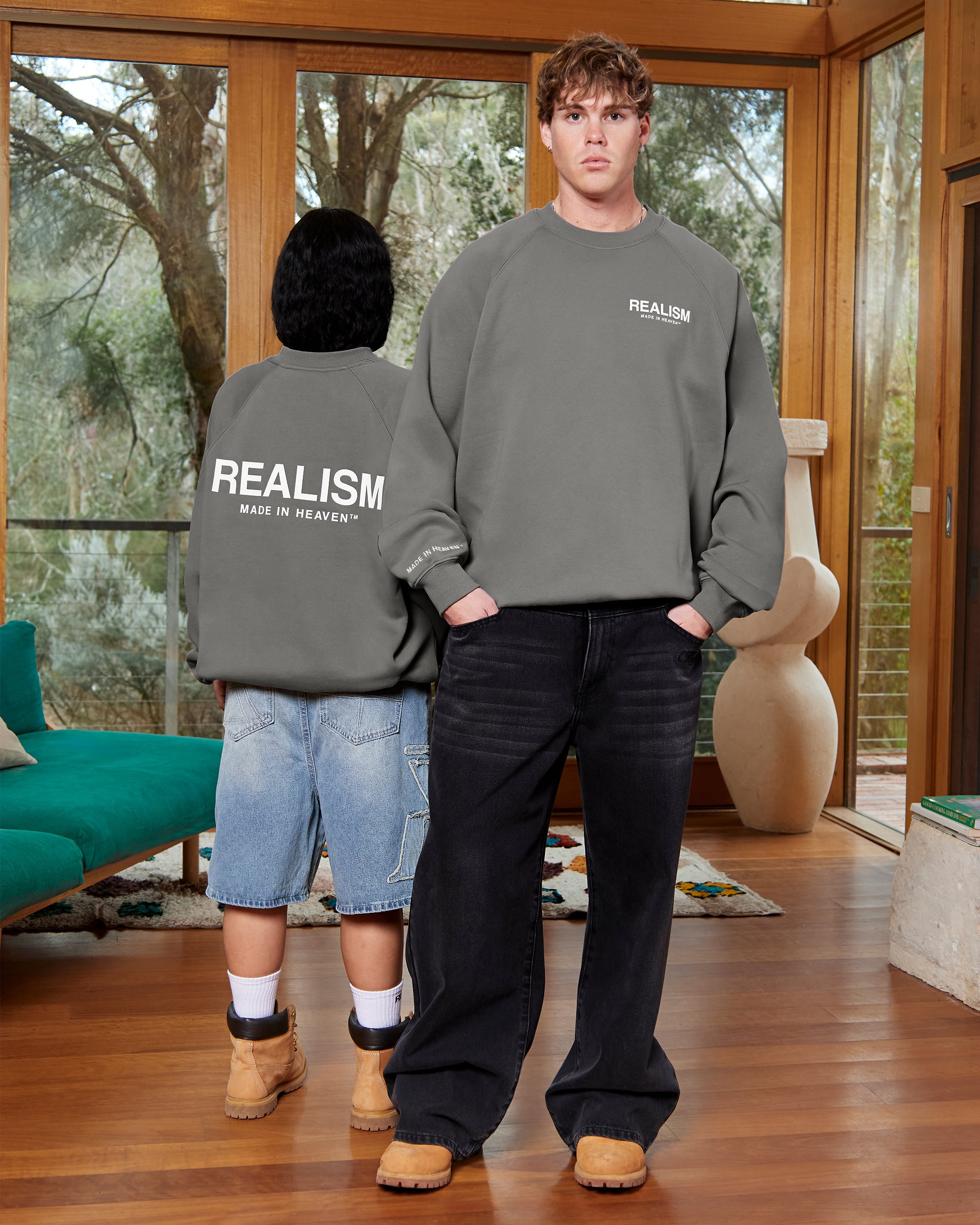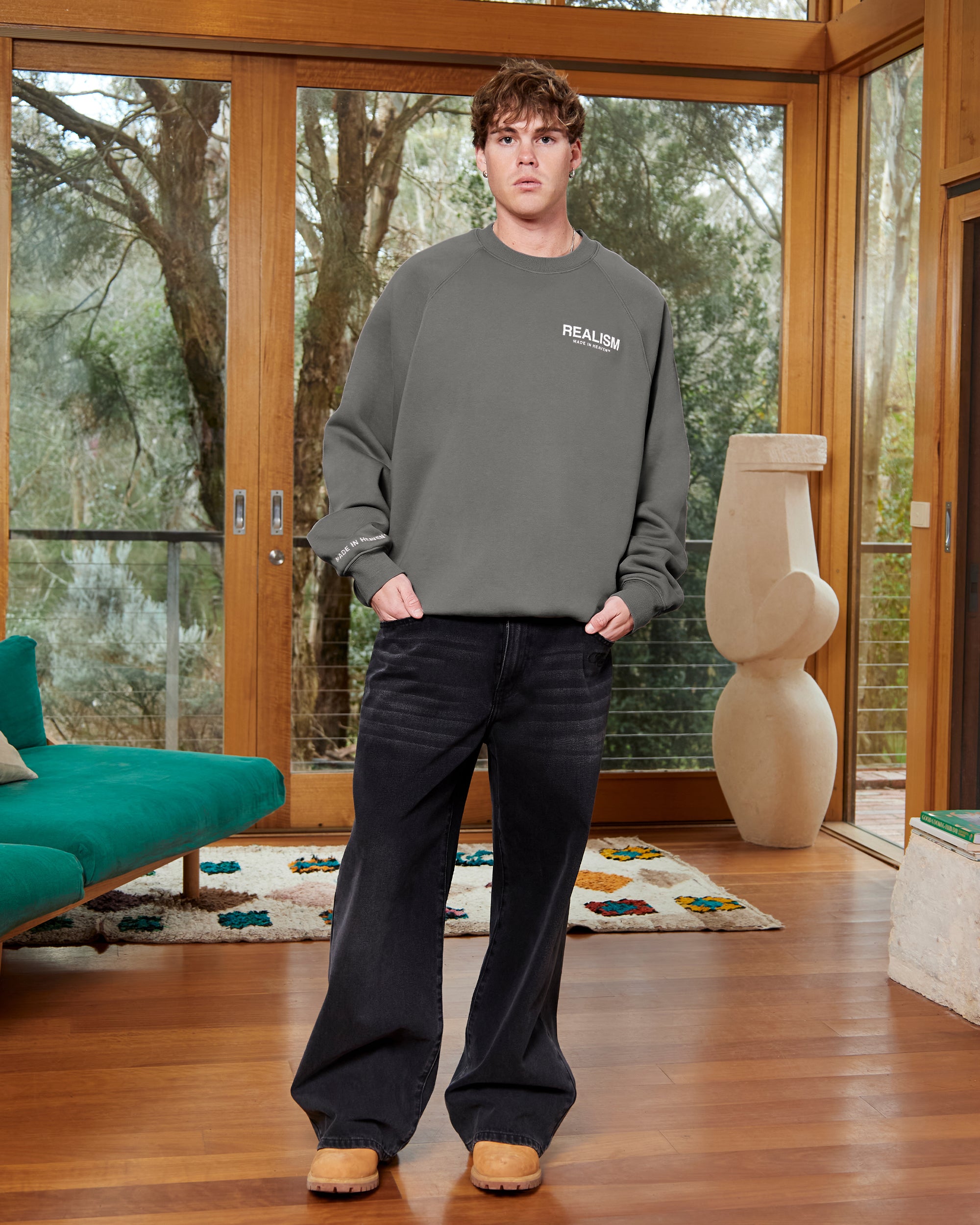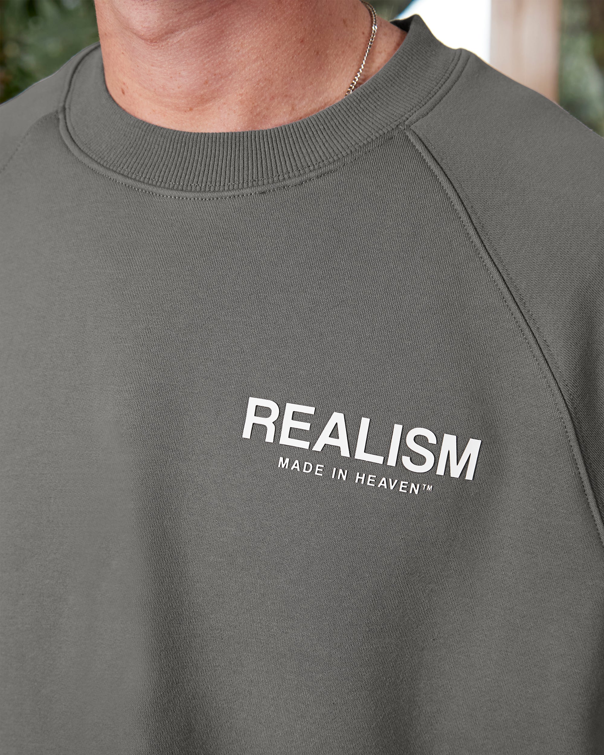 The ultimate crewneck. Premium, comfortable and designed with purpose. Featuring Realism's signature 350 GSM fleece crafted with a raglan oversized silhouette, this crewneck is accentuated with 3D Silicone Applique Logos on Front and Back on the front and back. An embroidered "Made in Heaven" motif on the right sleeve completes this iconic design.