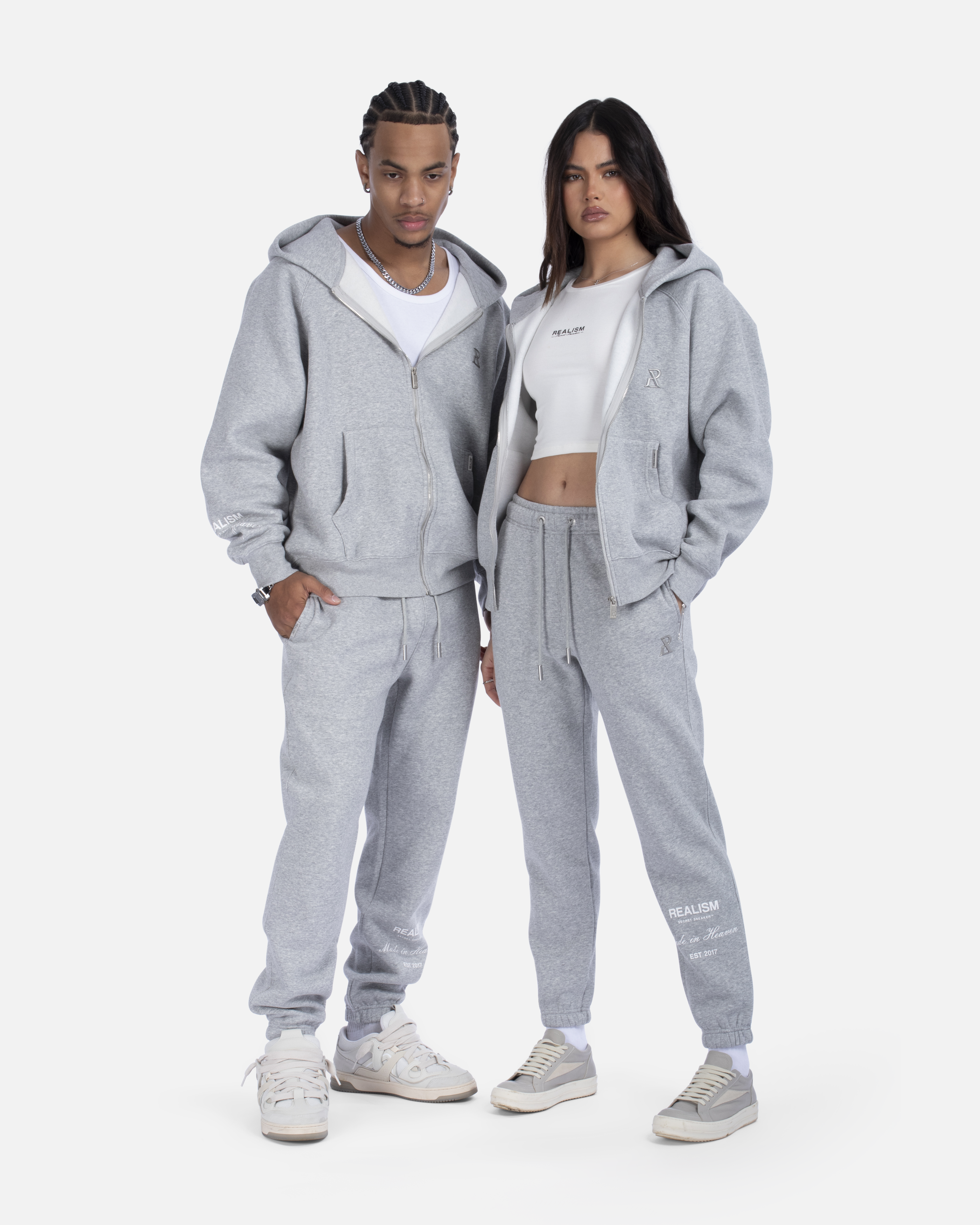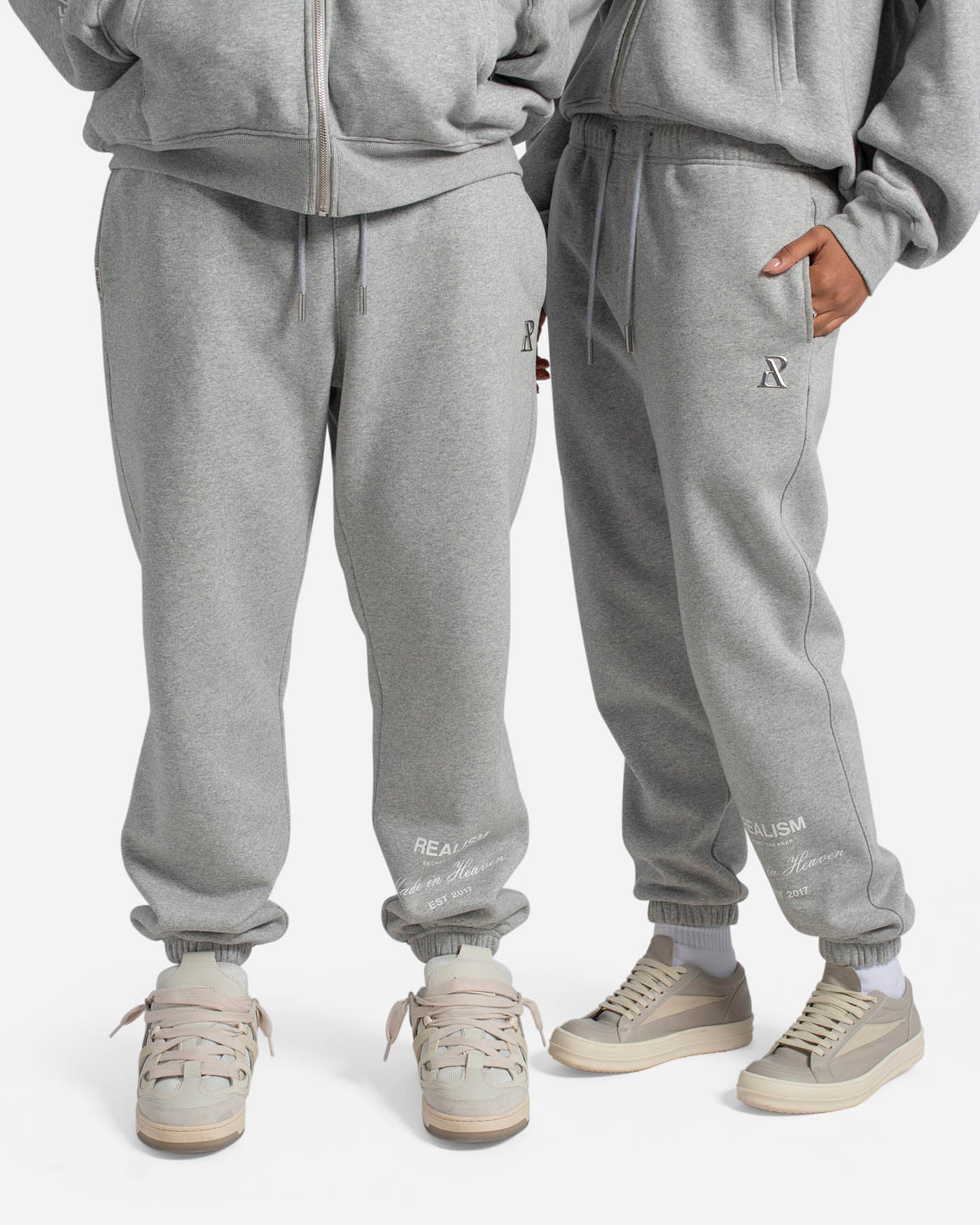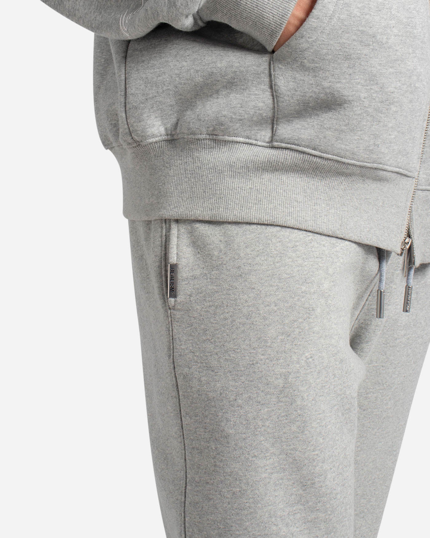 This classic silhouette is refreshed with a deluxe signature from the Realism Radiant collection. Made with Realism's signature comfy fleece in a relaxed Marle Grey guise, this sweatpant features metal accents including custom "R" branded drawstring openings & aglets, thigh emblem and tag. An embroidered "R" on the back pocket and shin print ties together a design that captures the essence of premium loungewear.