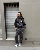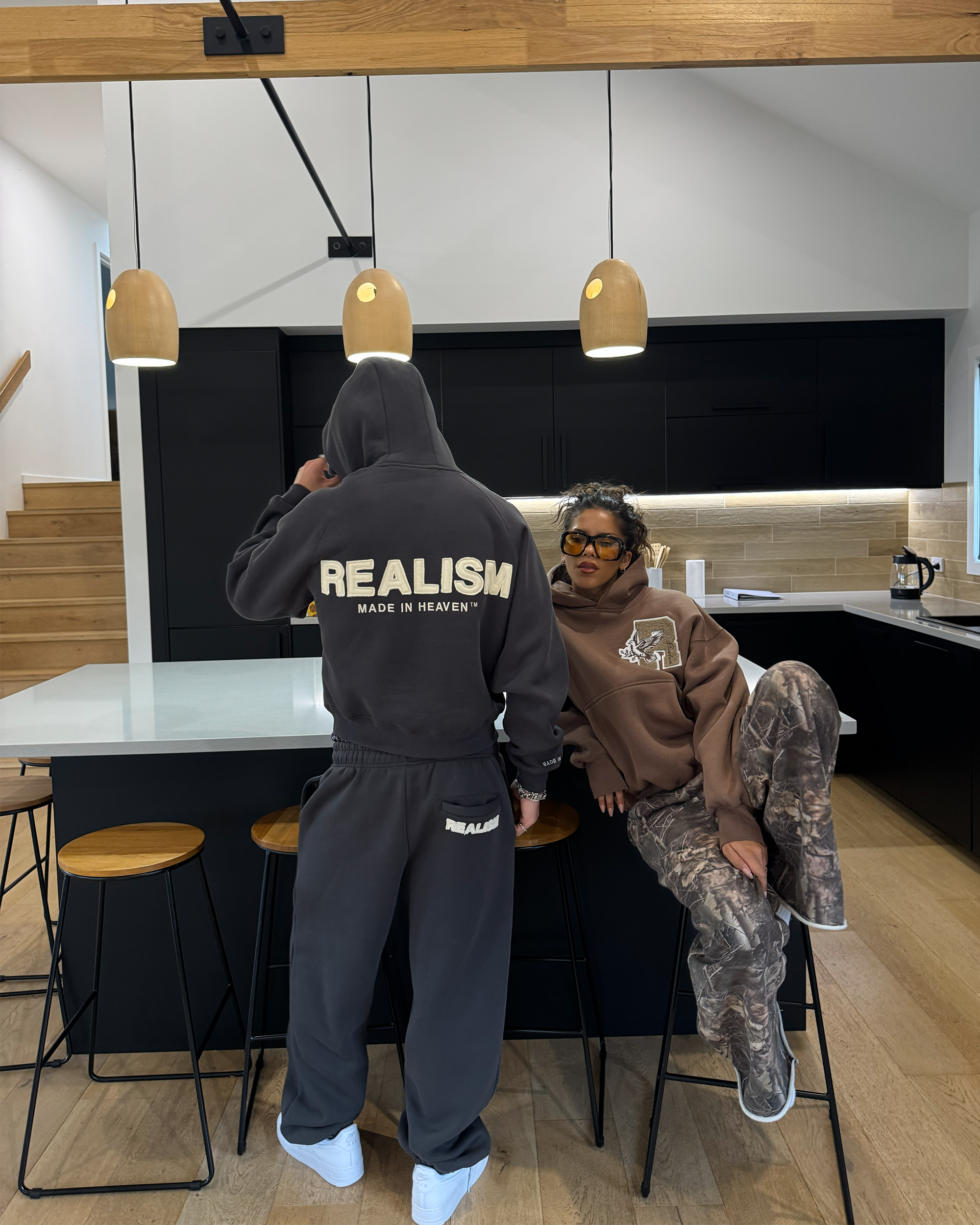 The Legacy Sweatpant in Shadow represents the next evolution of Realism's design identity. Made with Realism's signature fleece in a Shadow guise, these sweatpants feature a distressed patchwork “R” on the upper thigh and “REALISM” on the back pocket. Custom metal accents and embroidered “MADE IN HEAVEN” on the hem help bring together the design.