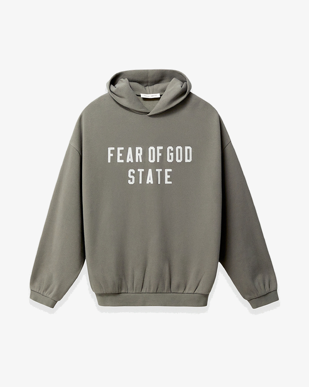 The Fear of God ESSENTIALS Moss '90s Fit Fleece Hoodie is a cozy, elevated layer built for everyday ease. It features a soft fleece lining, dropped shoulder long sleeves, an attached hood, a kangaroo pocket, ribbed trims, a rubber brand label on the hood, and the signature Fear of God State stitched embroidery on the front in a classic oversized fit.
