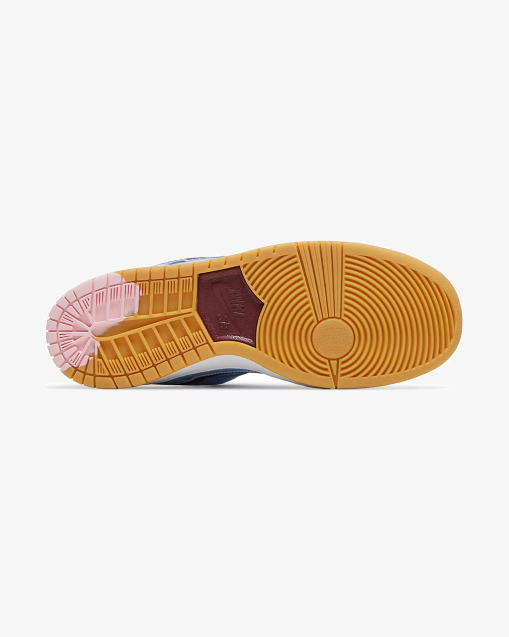 While the retro silhouette is rooted in basketball, the Nike Dunk Low Premium SB ‘Philadelphia Phillies’ shifts the focus to the baseball diamond, featuring a distinctive color palette that pays homage to the historic MLB franchise. The suede upper is finished in Valor Blue, contrasted by a Team Maroon Swoosh outlined in white trim. A Nike SB tag decorates the stuffed tongue, while mismatched interior tags display a cheesesteak graphic on the left shoe and a Liberty Bell graphic on the right. Underfoot, a gum rubber outsole provides grippy traction.