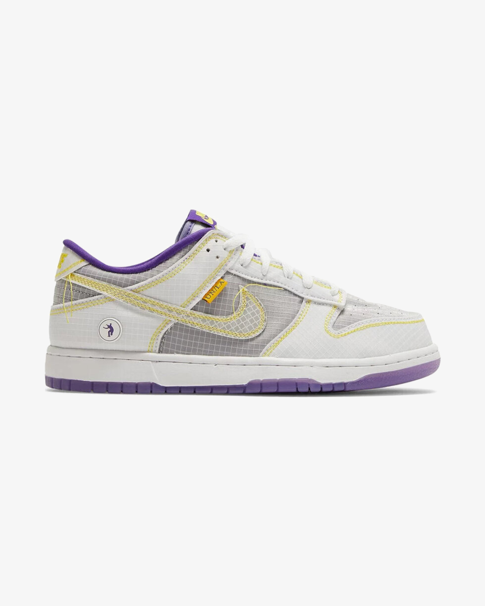The Nike Dunk Low Union LA Passport Pack Court Purple draws a resemblance to the 1999 Nike Dunk High CO.JP City Pack. Beneath a tear-away ripstop shroud, it features a Court Purple and white smooth leather construction. From there, a Union LA Frontman logo on the heel and "UN|LA" quarter panel tabs add the finishing touch.