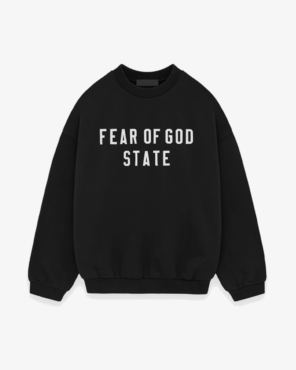The Heavy Fleece Crewneck is made from heavyweight 520gsm, 100% cotton fleece with a subtle vintage wash. The designed volume creates a round, cropped silhouette. A collegiate-inspired "Fear of God State" satin twill varsity lettering is stitched across the front. Details include a rib-knit collar, cuffs, waist-hem, and side pockets. The Essentials Fear of God rubberized label is at the back collar.