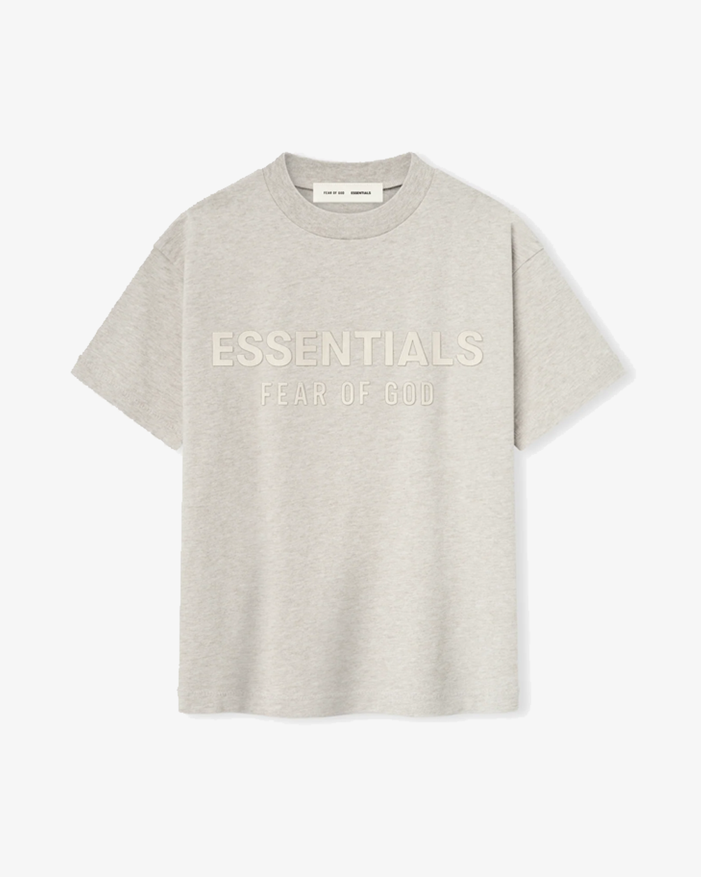 The Kids Classic Tee is made from medium-weight 100% cotton jersey. The crewneck tee features a classic fit with signature relaxed proportions. Branding includes a new "Essentials Fear of God" beveled metallic logo on the front and a "Fear of God Essentials" rubberized label at the back collar.