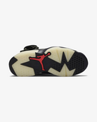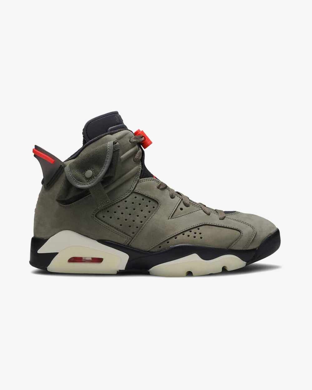 The Travis Scott x Air Jordan 6 Retro 'Olive' represents a collaboration between the Houston based rapper and Jordan Brand. This take on the AJ 6, which Scott debuted while performing during halftime of Super Bowl 53, released in October 2019. It features a Medium Olive, black, Sail and University Red colorway along with several unique elements: a small pocket with a snap on the collar, a nubuck and suede upper, Scott's 'Cactus Jack' logo on the heel and a glow-in-the-dark translucent outsole.