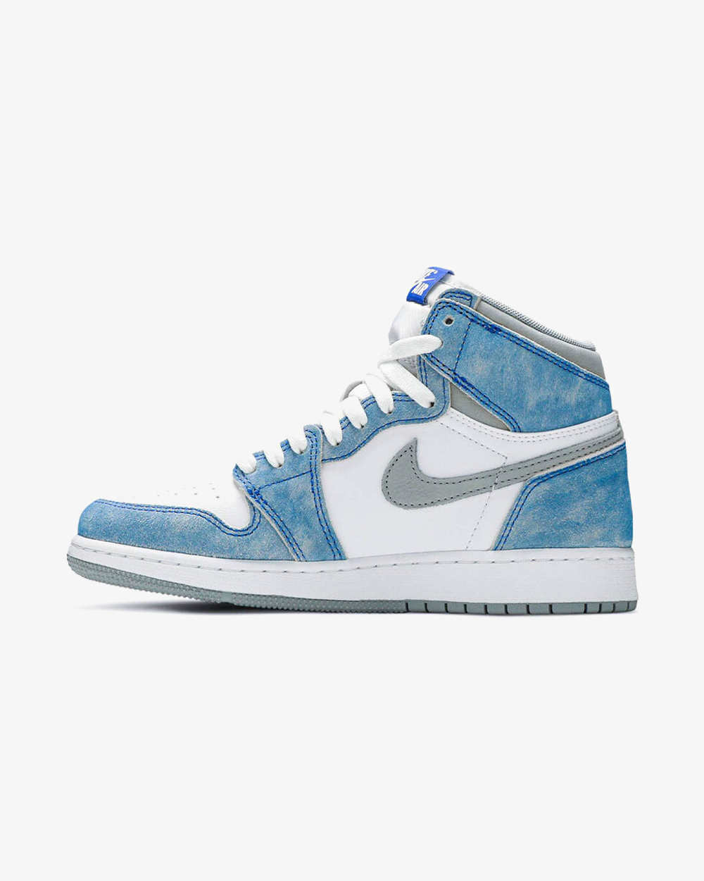 Made for big kids, the Air Jordan 1 Retro High OG GS ‘Hyper Royal’ showcases a distressed aesthetic, highlighted by pale blue suede overlays in a faded, uneven finish. The rest of the upper is constructed from white leather with signature Swoosh branding in light grey nubuck. Nike Air hits on the sockliner and woven tongue tag confer an OG touch. The high-top is mounted on a standard AJ1 cupsole, complete with encapsulated Air sole cushioning.