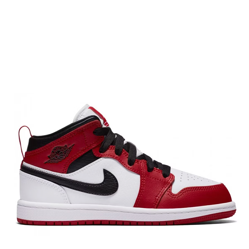 The White, Gym Red, and Black-dressed Air Jordan 1 Mid Chicago 2020 PS is a specific variation of Air Jordan 1 Mid sneaker that appears in the preschool sizing.