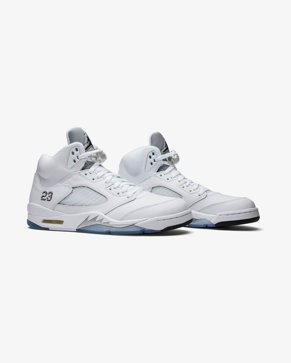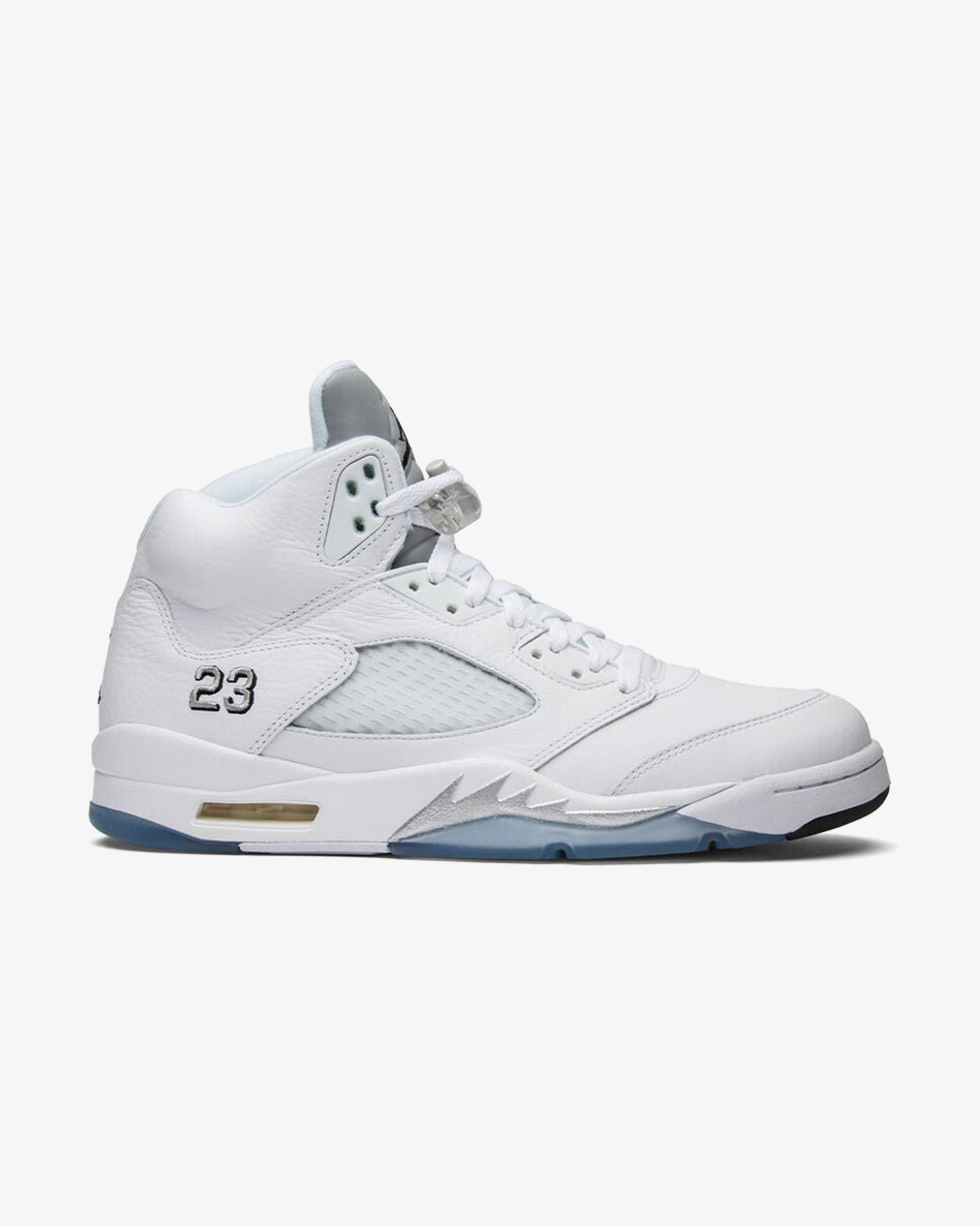 Released in April of 2015, the Air Jordan 5 Retro ‘Metallic White’ 2015 offers a remastered version of the colorway first released back in 2000. The sneaker has a white tumbled leather upper with metallic silver and black accents on an ice blue translucent outsole.