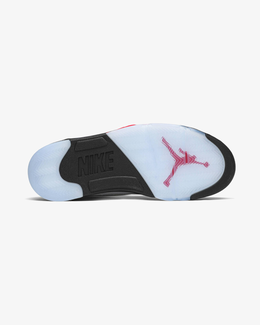 The 2020 edition of the Air Jordan 5 Retro ‘Fire Red’ brings back the OG colorway of the classic silhouette on the occasion of its 30th anniversary. The build is faithful to the original, featuring a white leather upper with a silver reflective tongue and Nike Air branding on the heel. The black midsole, embellished with red shark tooth detailing inspired by a WWII P-51 Mustang fighter plane, is reinforced by an icy translucent outsole.