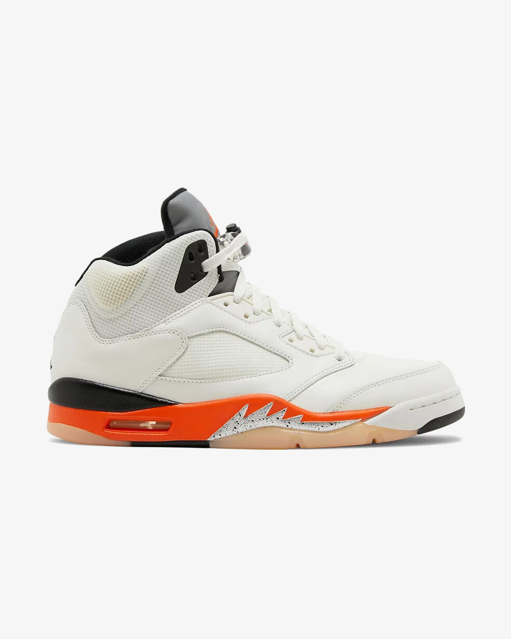 The Air Jordan 5 Retro ‘Shattered Backboard’ showcases a familiar palette on a reconstituted build. The upper combines traditional white leather construction with textile mesh on the collar, throat and quarter panel, replacing the plastic netting of the original. An embroidered orange Jumpman adorns the reflective matte silver tongue. The mid-top is mounted on an orange polyurethane midsole, fitted with a visible Air-sole unit in the heel and accented with silver shark tooth detailing. Underfoot, a milky translucent outsole features a herringbone tread for optimal grip.