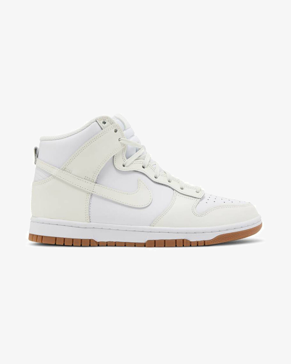The Nike women’s Dunk High ‘Sail Gum’ treats the timeless silhouette to an equally timeless color scheme. The high-top utilizes an all-leather upper that weds a pristine white base with subtle off-white overlays at the forefoot and heel. Details include a perforated toe box, a padded high-cut collar and a breathable nylon tongue. Underpinning the sneaker is a white rubber midsole, reinforced underfoot by a gum rubber outsole originally designed for pivoting on the hardwood.