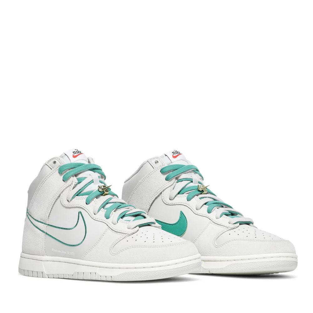 Built for big kids, the Nike Dunk High SE GS ‘Green Noise’ is taken from the ‘First Use Pack,’ a footwear collection that celebrates the 50th anniversary of the Nike Swoosh. The retro silhouette makes use of an upper crafted from off-white leather with tonal suede overlays at the forefoot and heel. A green leather Swoosh adorns the sneaker’s medial side, while the opposite side features a retro Swoosh outlined in green embroidery. White lettering on the quarter panel reads ‘First use June 18, 1971.’ The high-top is secured with doubled-up green and white laces that are decorated with a Swoosh-shaped lace jewel in metallic gold.