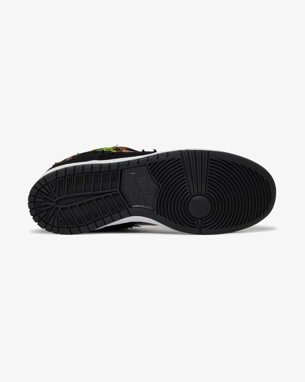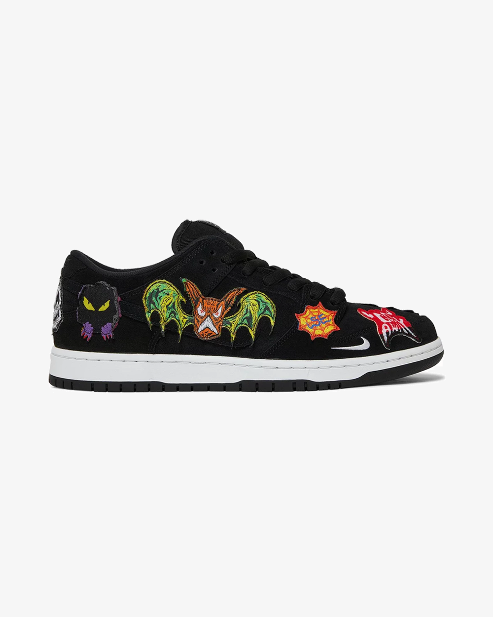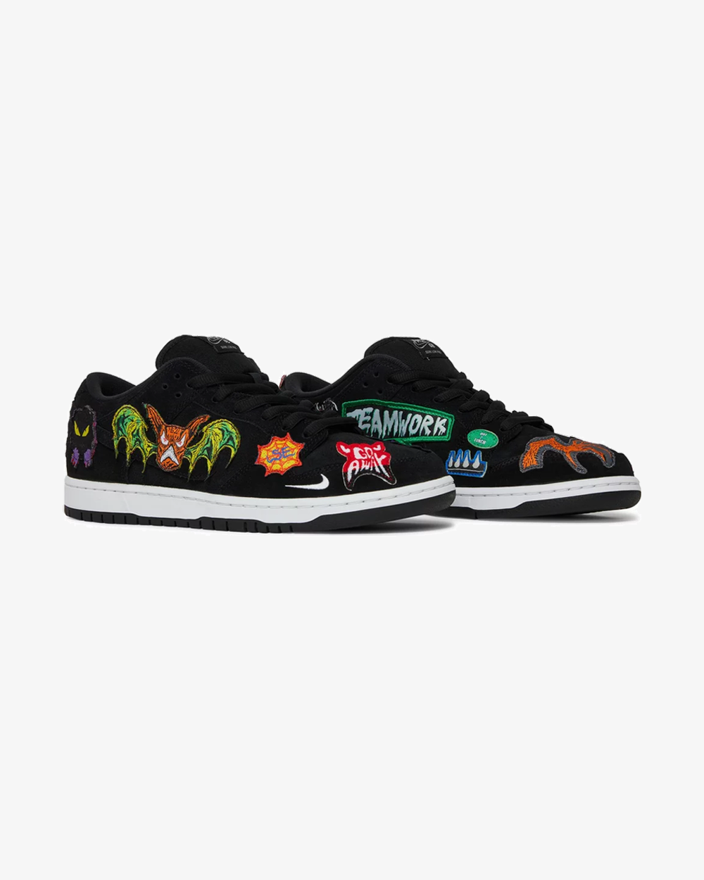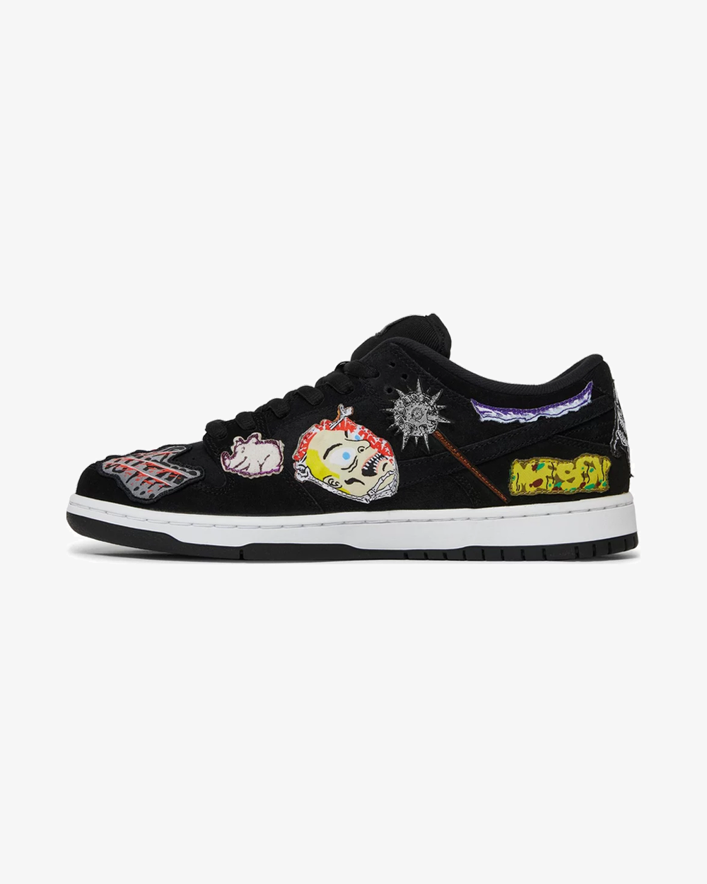 The Neckface x Nike Dunk Low Pro SB ‘Black’ reunites the Swoosh with the LA-based graffiti artist. His macabre designs appear on a series of unique patches that cover the black suede upper. Mismatched tongue tags display ‘Neck SB’ and ‘Face SB’ branding, while embroidered mini-Swooshes adorn the collar and forefoot of the left and right shoe, respectively. The sneaker rests on a white rubber midsole, featuring a wraparound ‘Shockers’ graphic on the left shoe.