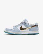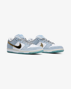 The Nike SB Dunk Low Sean Cliver is filled with holiday cheer. The upper holds a mix of sky blue suede and white tumbled leather, adding luxe looks to the skateboarding sneaker.