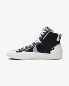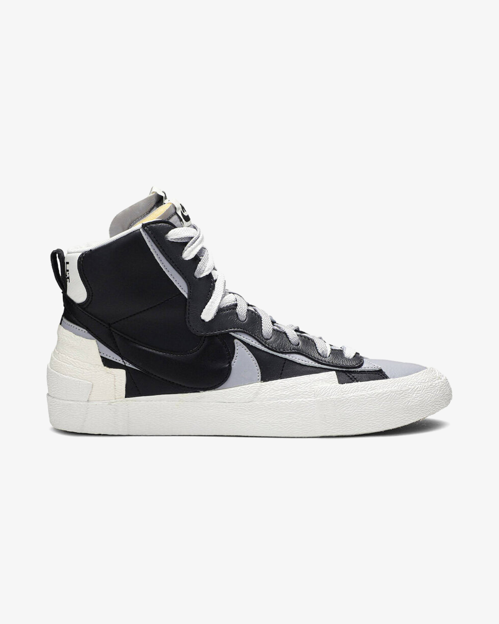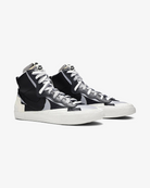 The Sacai x Nike Blazer Mid translates the Japanese fashion label's deconstructed aesthetic using two-fold design elements. Unveiled in October 2019, this version's black leather upper has twin tongues with exposed padding, layered Swooshes and stacked eyestays. Co-branding details the heel. Textured rubber panels pile up on the counter and sidewall. Its signature cupsole stays classic with herringbone-patterned gum tread.