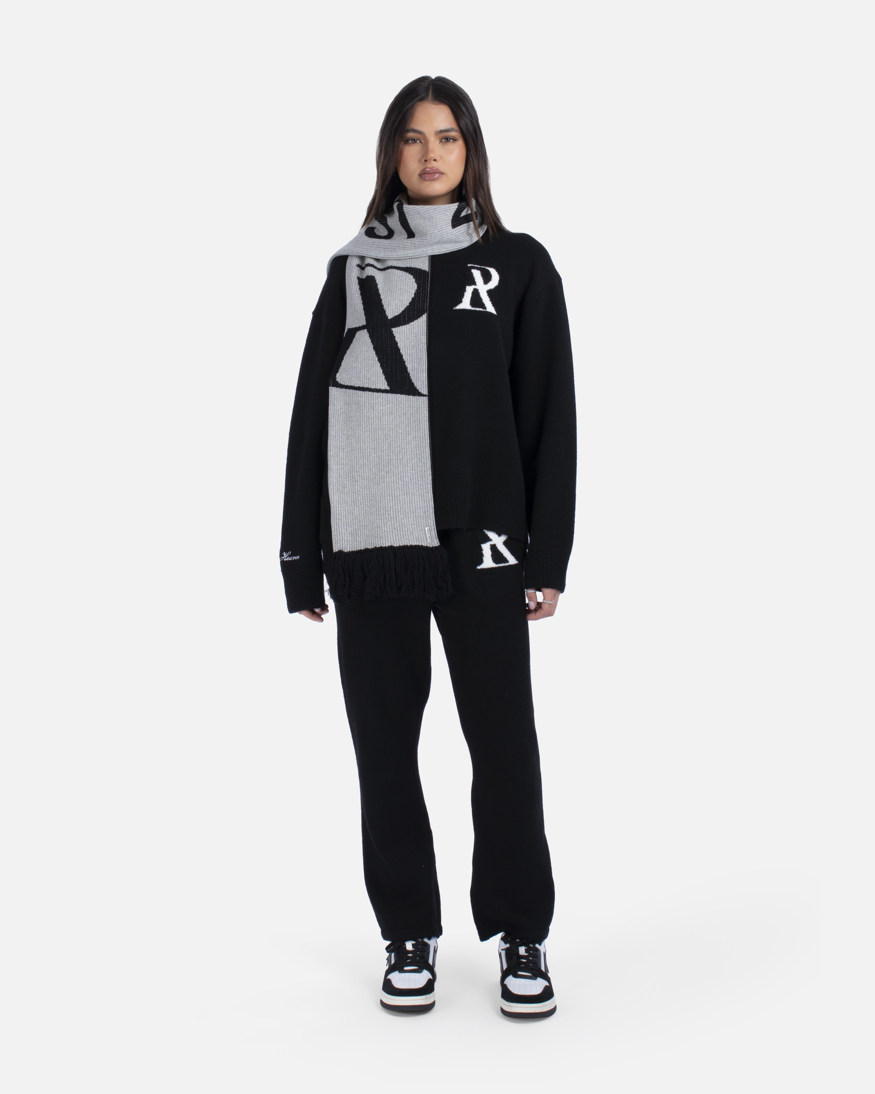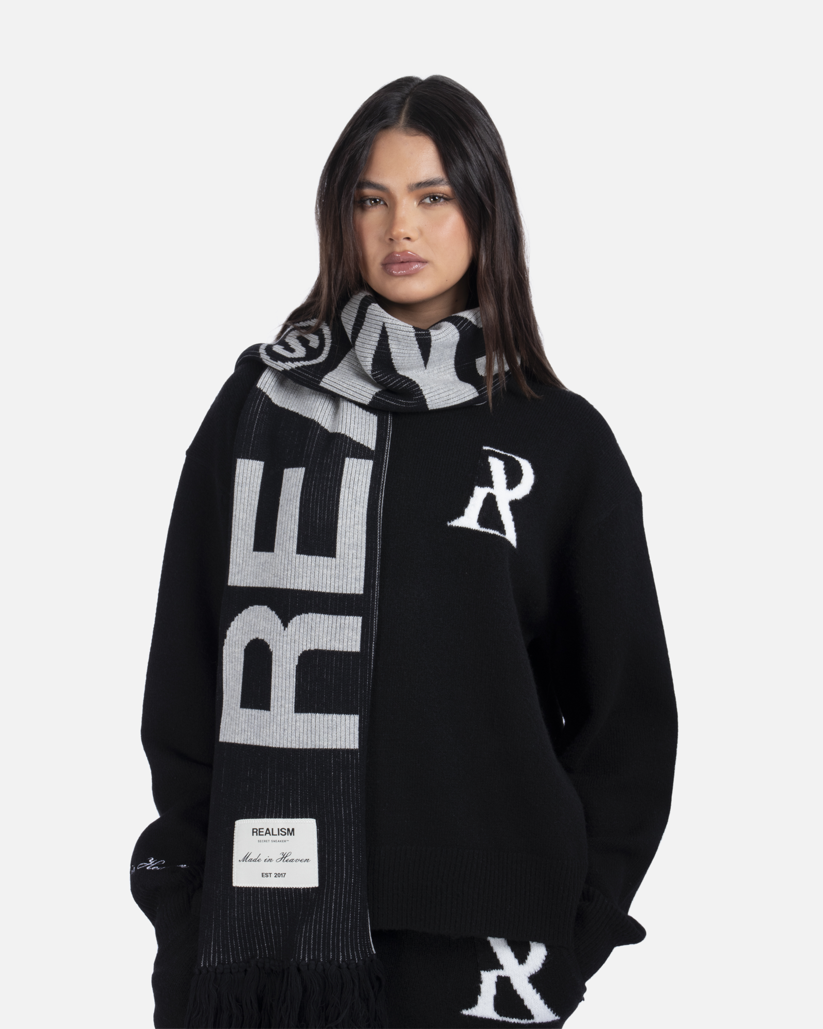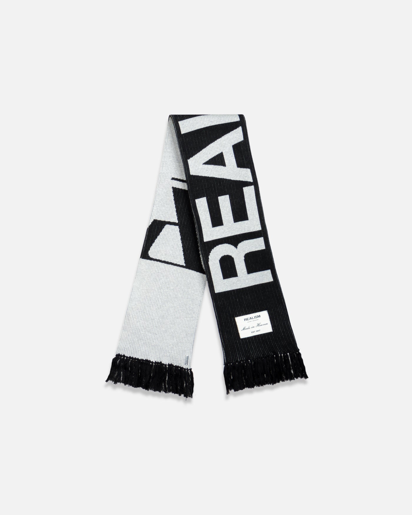 This essential accessory is refreshed with a deluxe signature from the Realism Radiant collection. Made with an alternating jacquard knit in a black & white guise, this scarf features a metal "Realism" plaque, woven label & black tassels. Knitted "REALISM", "EST 2017" & "R" emblem motifs elevate a design that captures the essence of premium loungewear.