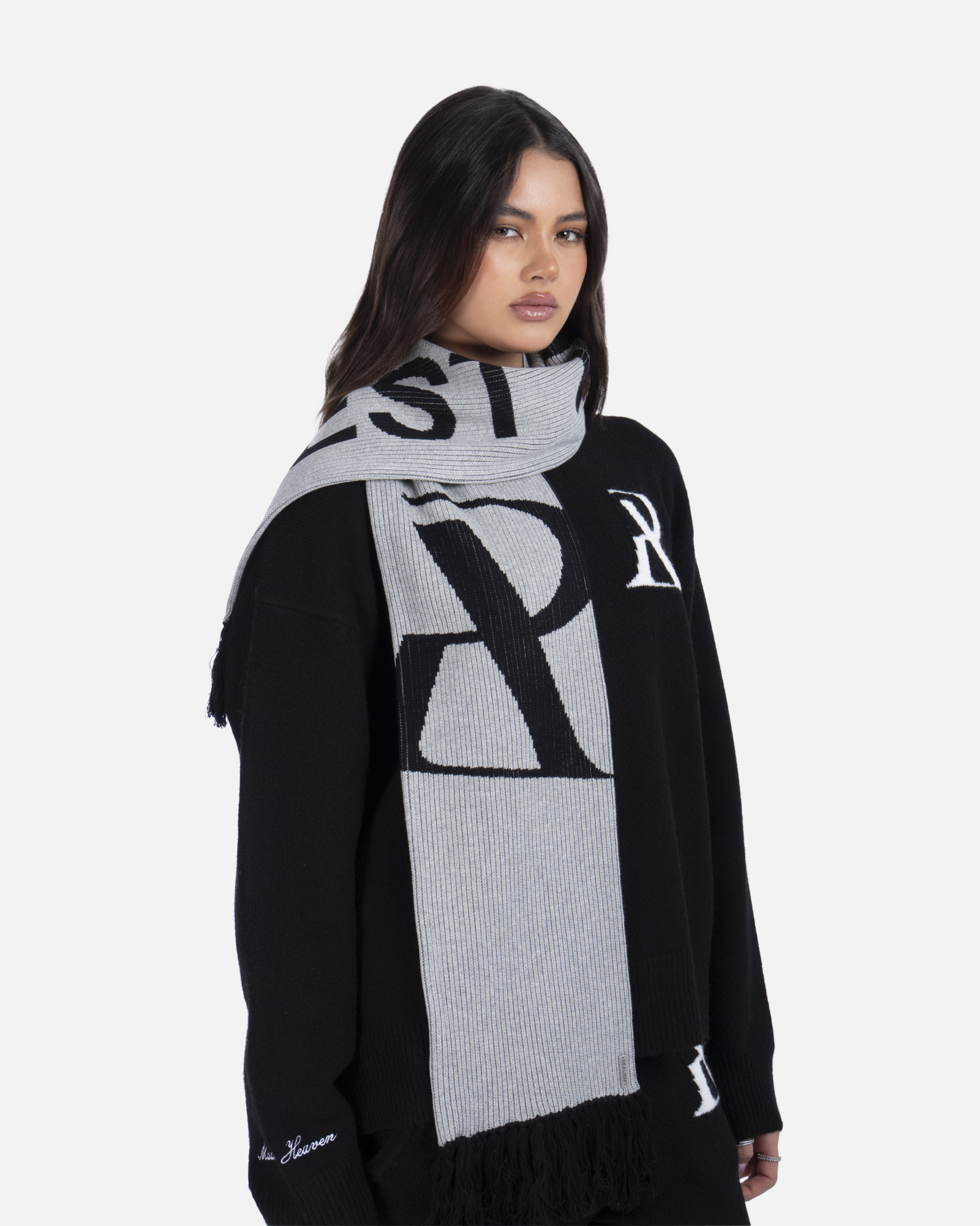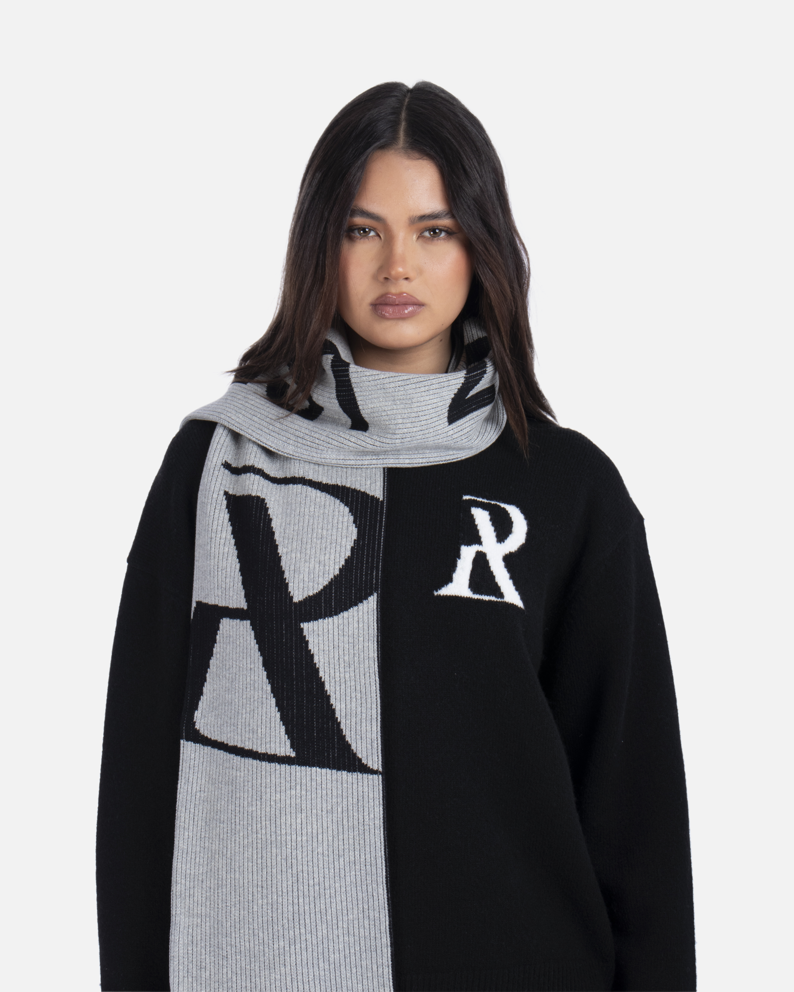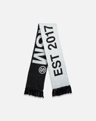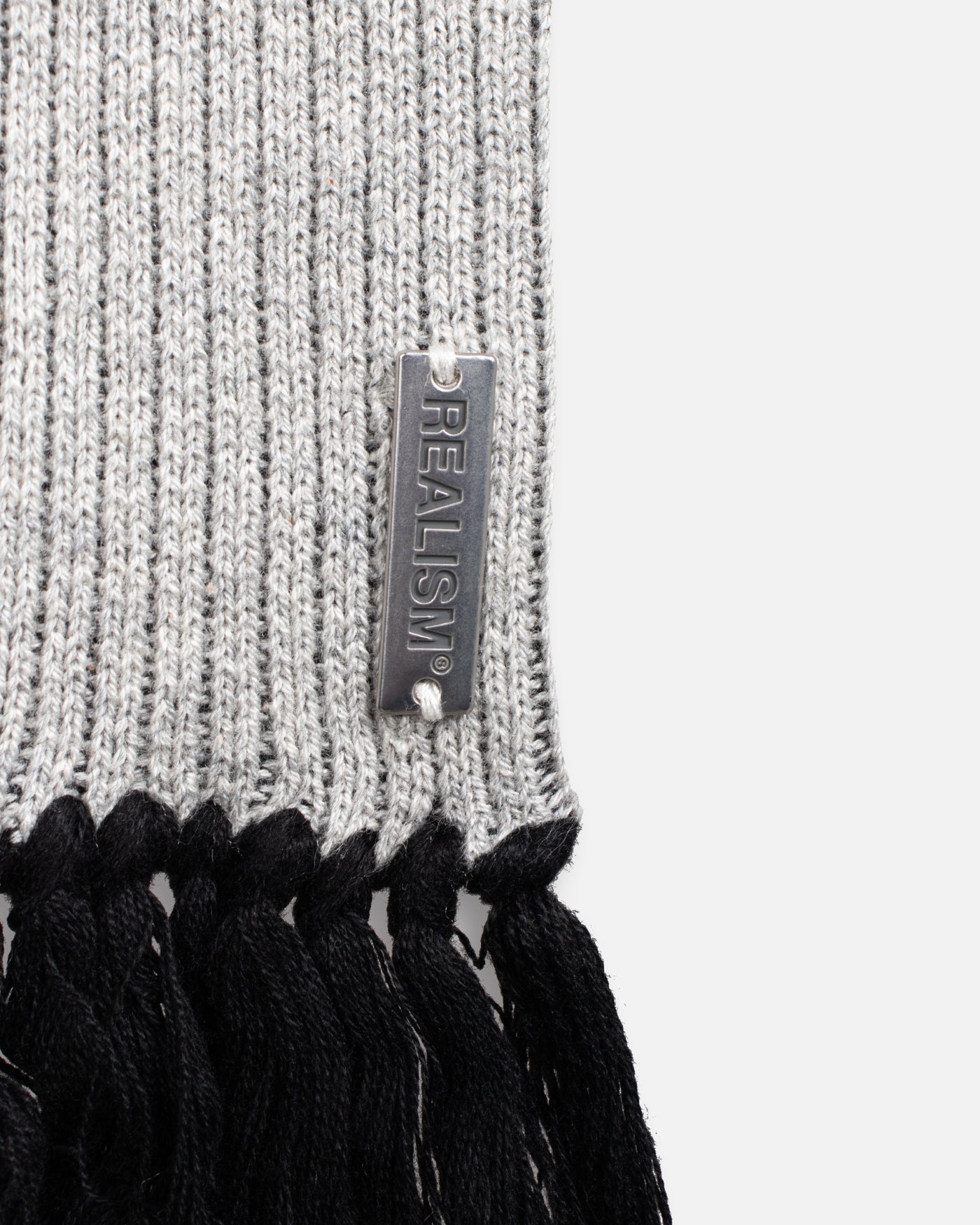 This essential accessory is refreshed with a deluxe signature from the Realism Radiant collection. Made with an alternating jacquard knit in a black & white guise, this scarf features a metal "Realism" plaque, woven label & black tassels. Knitted "REALISM", "EST 2017" & "R" emblem motifs elevate a design that captures the essence of premium loungewear.