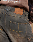 • Angled back pockets with custom double stitched embroidery