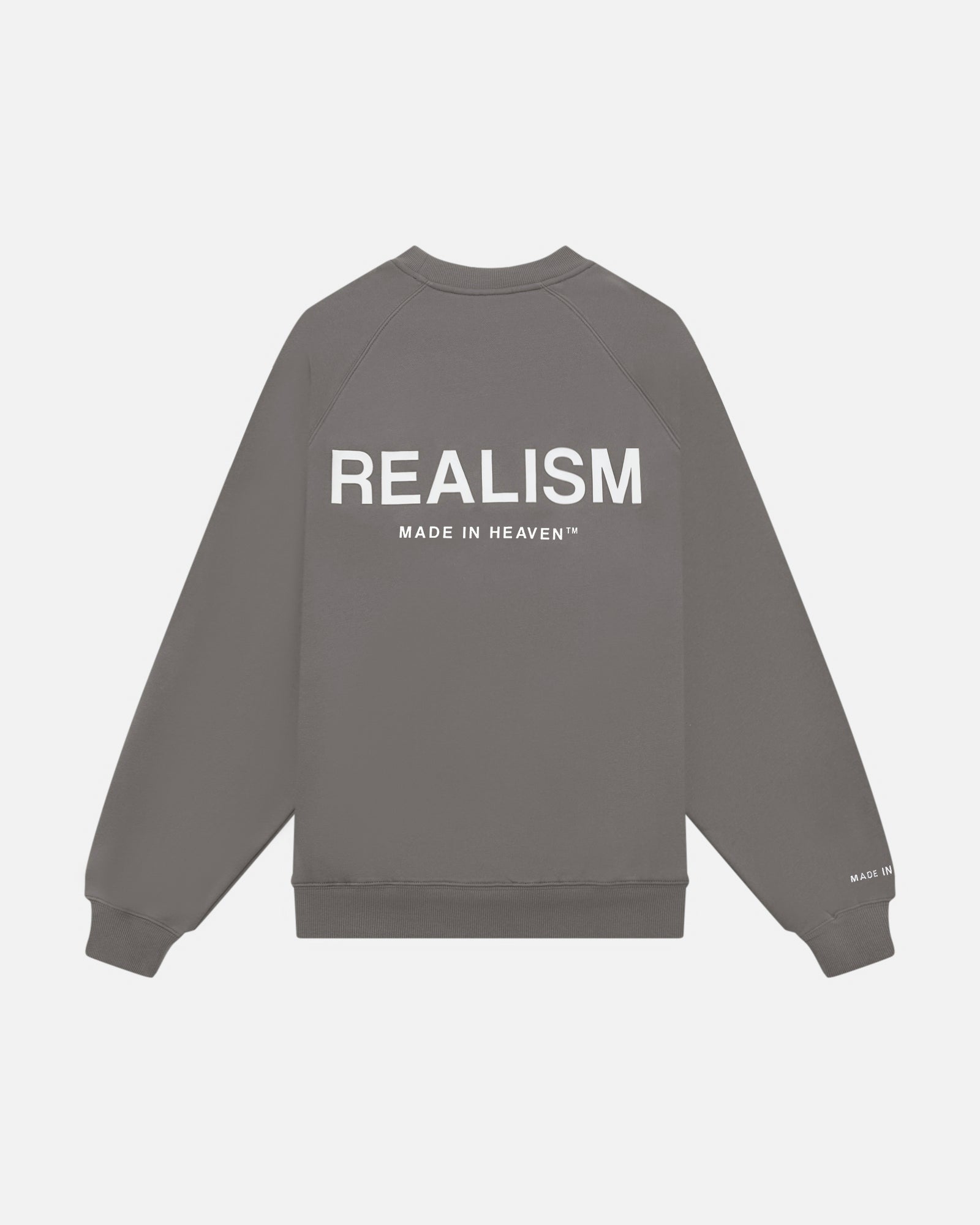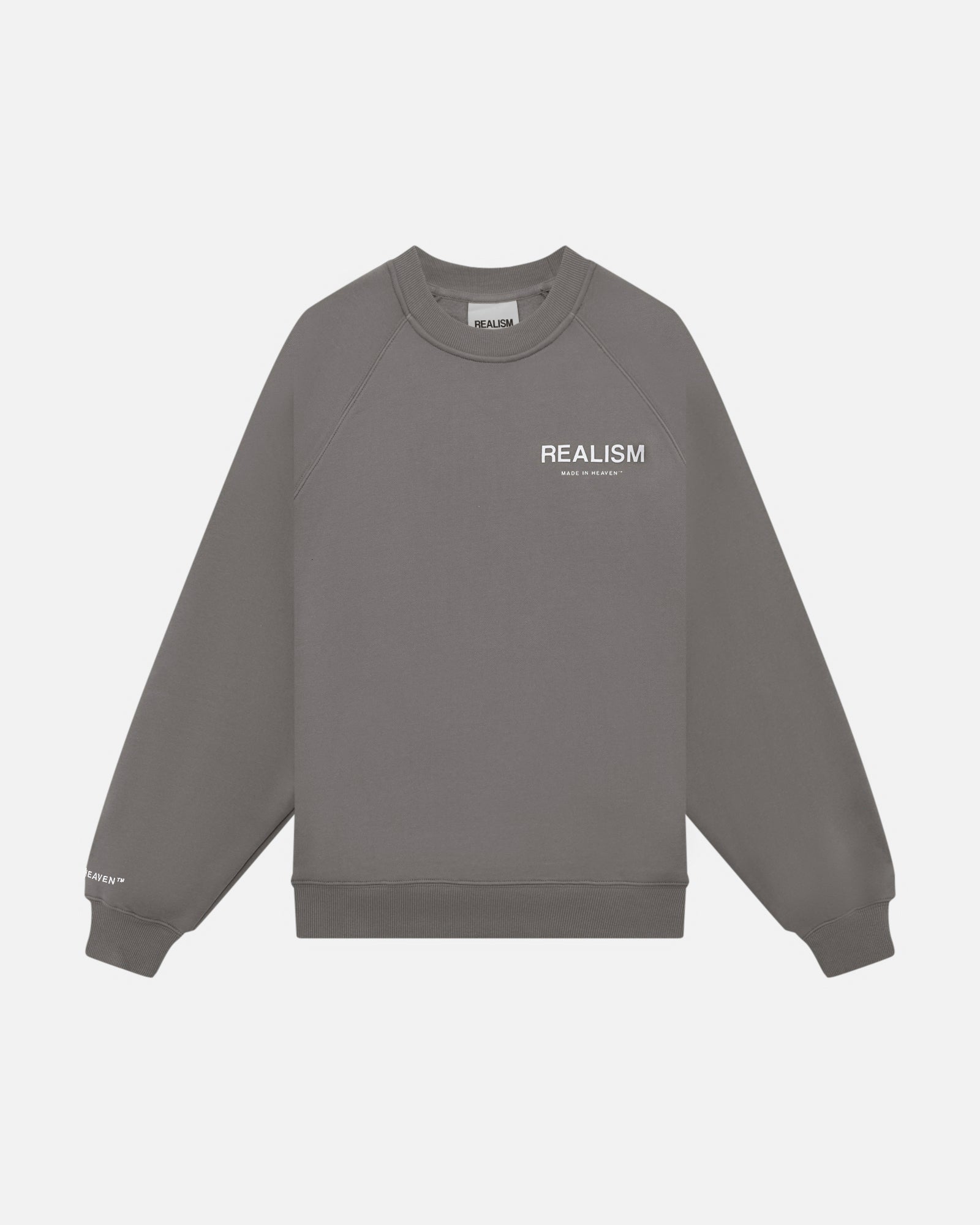 The ultimate crewneck. Premium, comfortable and designed with purpose. Featuring Realism's signature 350gsm fleece crafted with a raglan oversized silhouette, this crewneck is accentuated with 3D Silicone Applique Logos on Front and Back on the front and back. An embroidered "Made in Heaven" motif on the right sleeve completes this iconic design.
