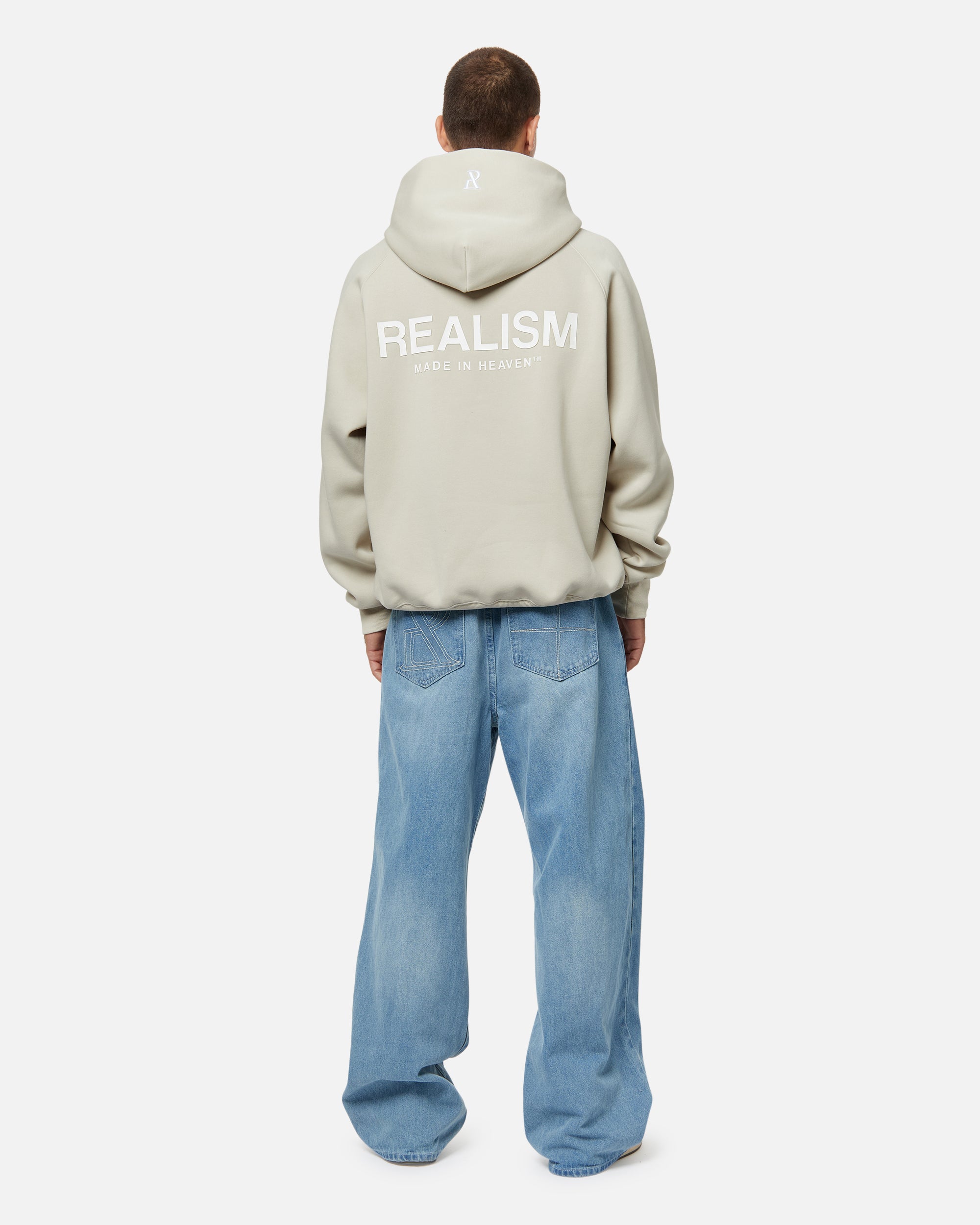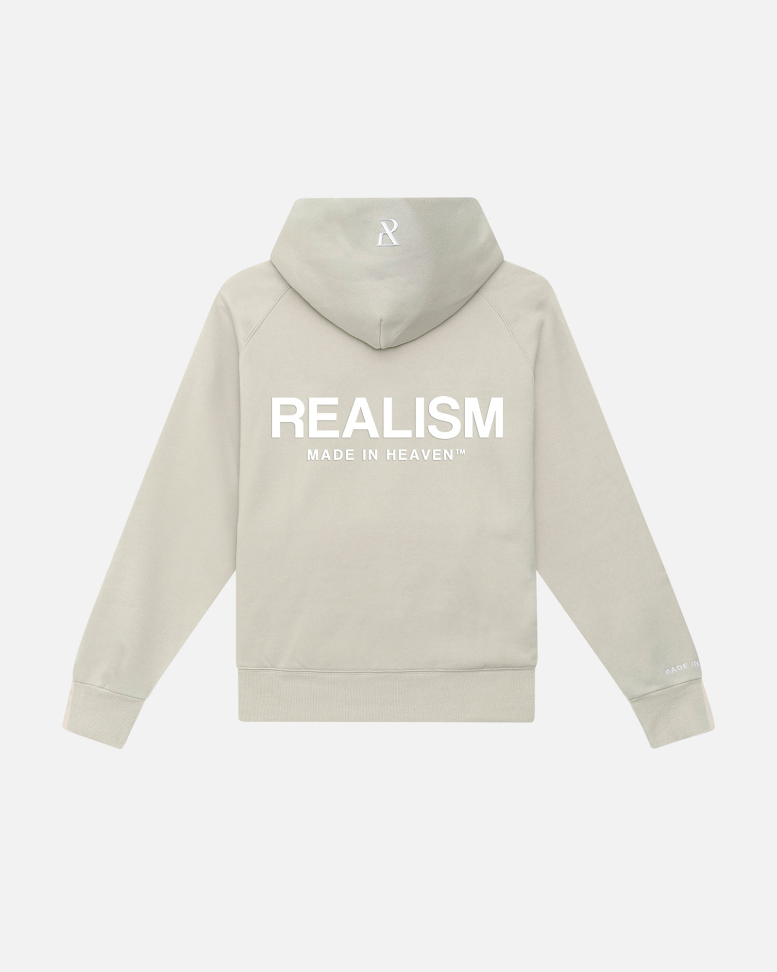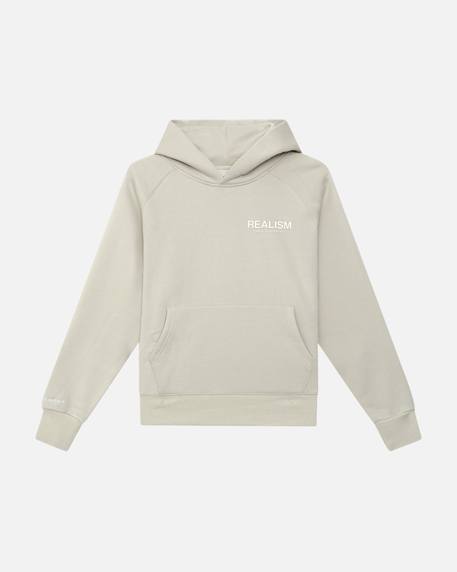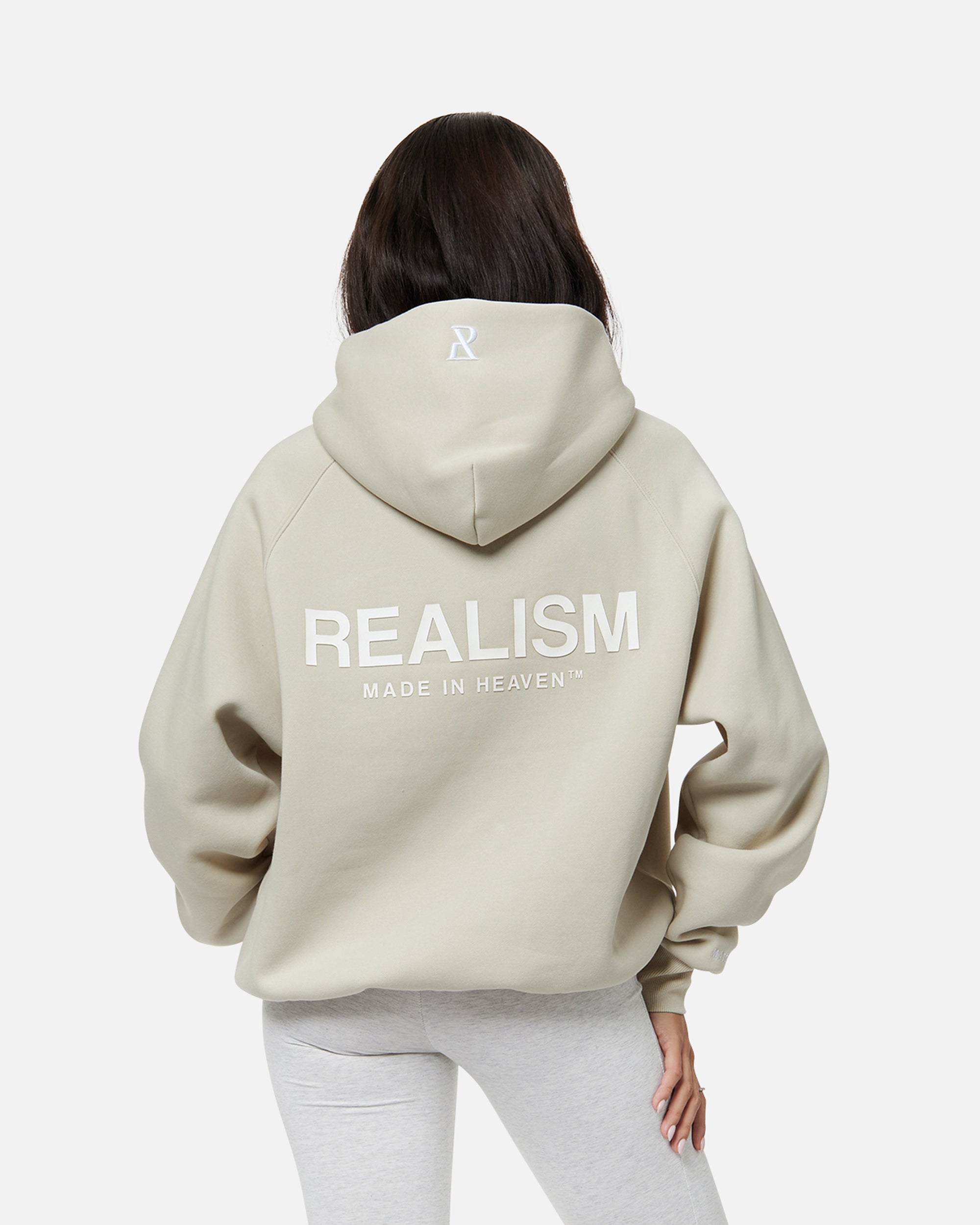 The ultimate hoodie. Premium, comfortable, and designed with purpose. Featuring Realism's signature 350gsm fleece crafted into a raglan, oversized silhouette, this hoodie is accentuated with 3-dimensional silicone applique logos on the front and back. An embroidered "R" logo on the hood and a "Made in Heaven" motif on the right sleeve complete this iconic design.