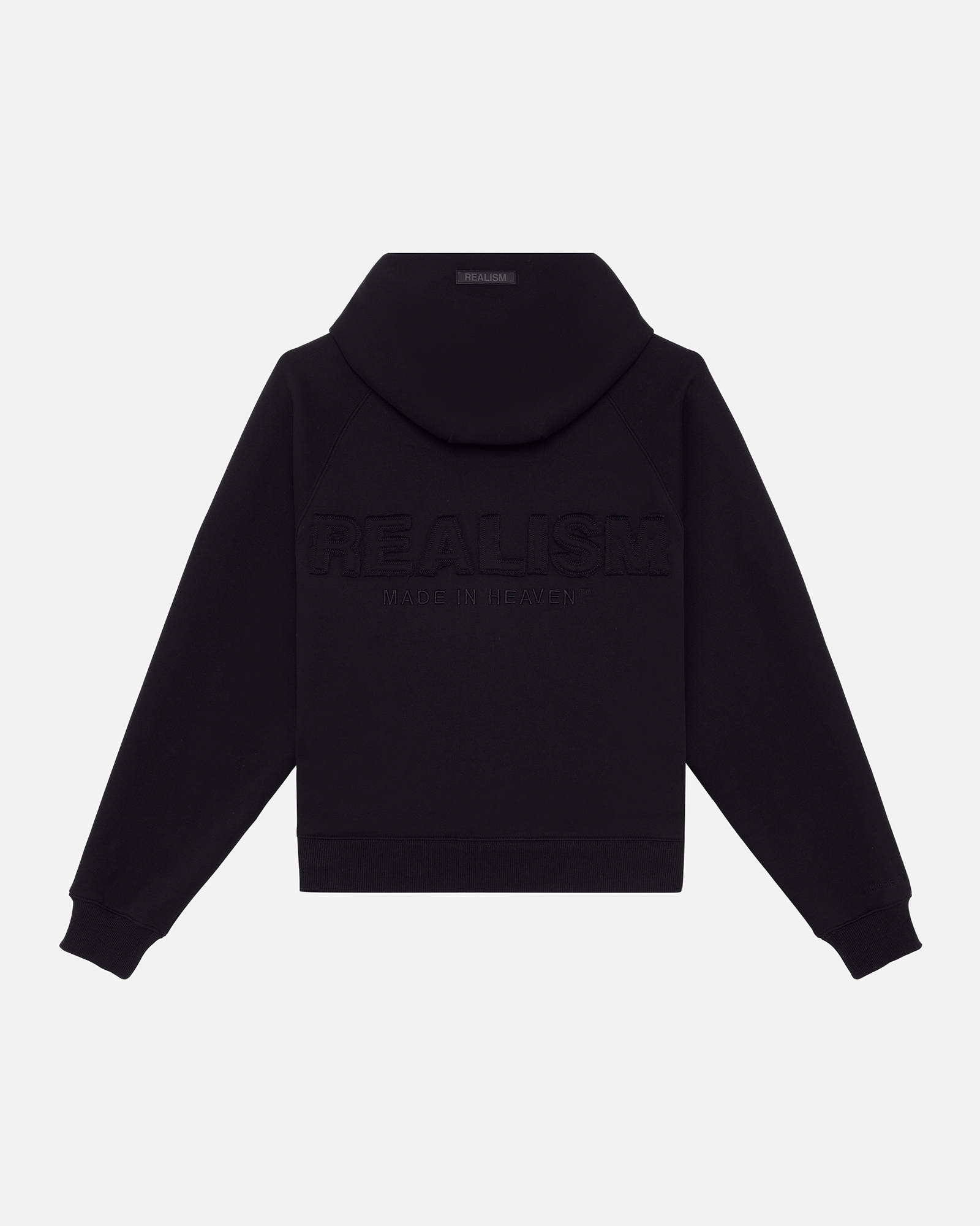 The Legacy Series represents the next evolution of Realism's design identity. Made with Realism's signature comfy fleece in a Black guise. This zip hoodie features distressed patch work including the “R” on chest and “REALISM” on back. Custom metal accents and silicon applique logo on the hood help bring together the design.