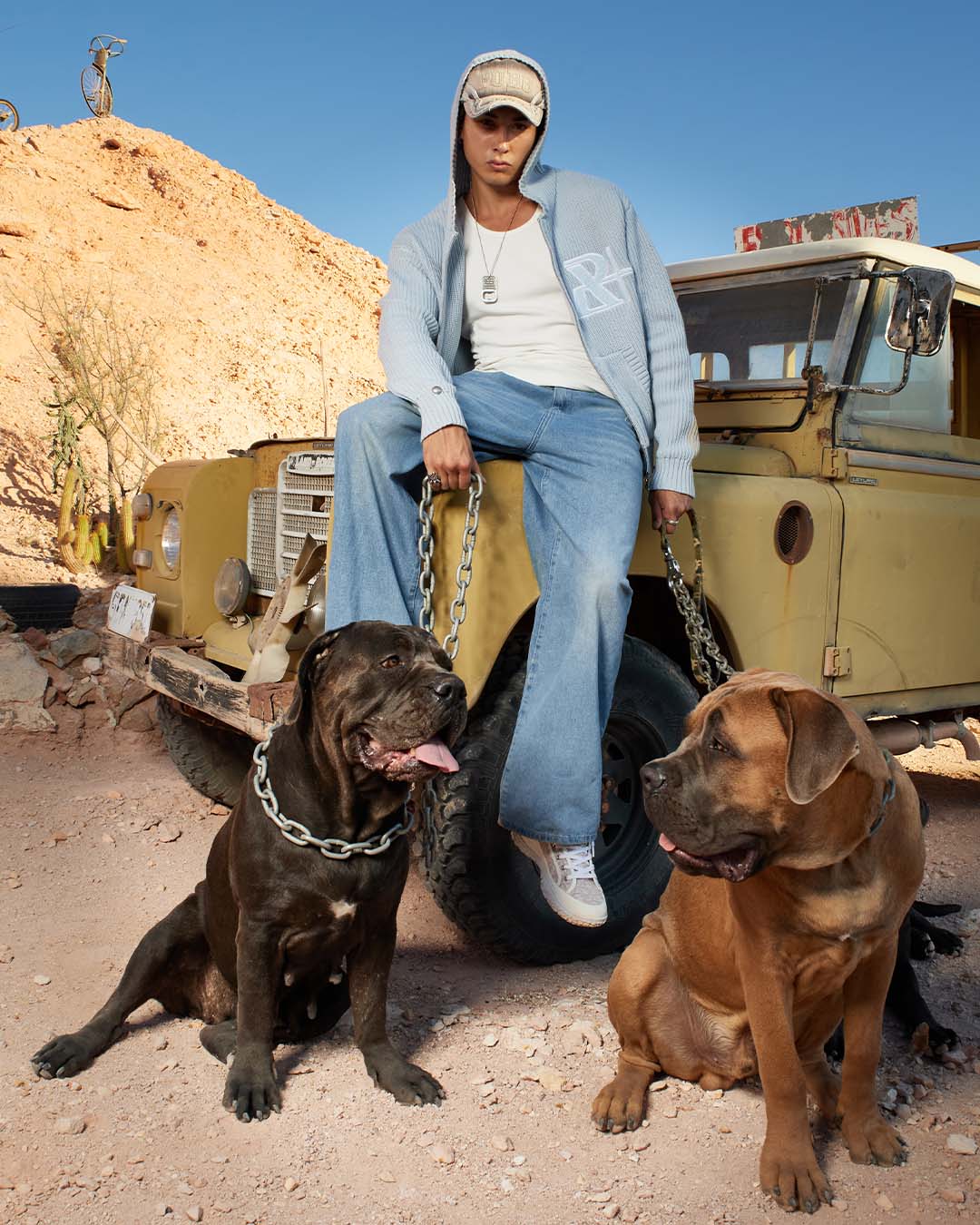 • Custom metal "R" logo zip and dome sleeve embellishment