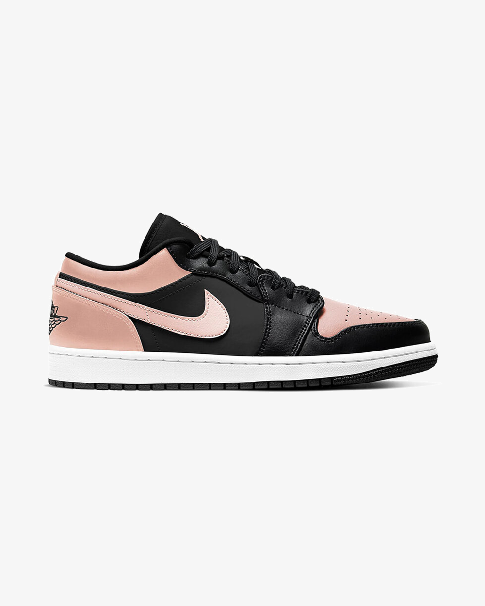 Crafted from premium-quality smooth leather, the black and light pink colourway looks better than ever on the AJ1, with Nike’s signature Swoosh logo running across both the lateral and medial sides. Additional branding comes in the form of a Jumpman logo embroidered onto the tongue and the wings logo across the heel. Underfoot, a white rubber midsole conceals high-end Nike Air cushioning that makes these a comfortable option for both the courts and the streets