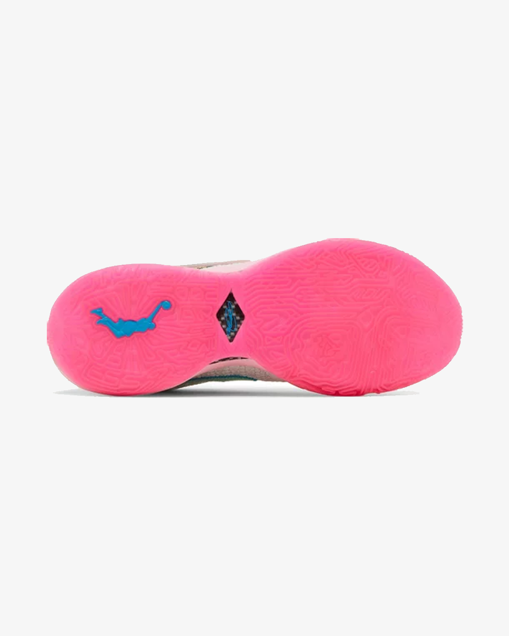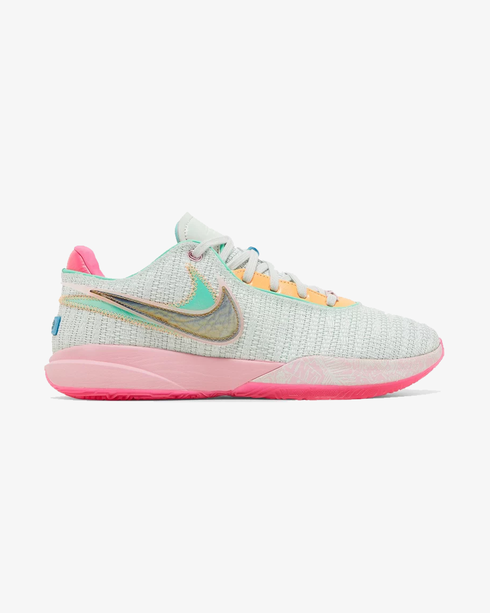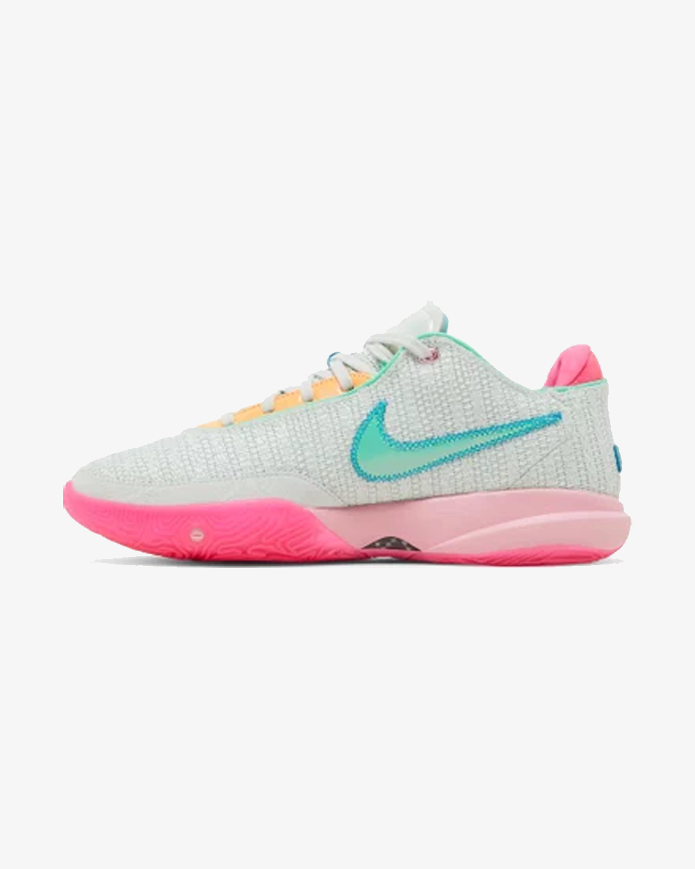 The Nike LeBron 20 ‘Time Machine’ douses LeBron James’ 20th signature shoe in tropical colors. A woven mesh upper in Barely Green is contrasted by a fuchsia-colored padded collar and a stitched leather eyestay in a vibrant orange hue. The lateral side displays an iridescent Swoosh stacked atop a turquoise Swoosh outlined in exposed deco stitching. Lightweight cushioning is provided by a pink Cushlon midsole, enhanced with a large Air Zoom Turbo unit in the forefoot and a bottom-loaded Zoom Air unit in the heel. The lateral forefoot is secured with a synthetic wrapped guardrail, featuring an intricate print denoting some of LeBron’s career highlights. Underfoot, a hot pink rubber outsole reveals a carbon fiber shank plate alongside LeBron’s Dunkman logo.