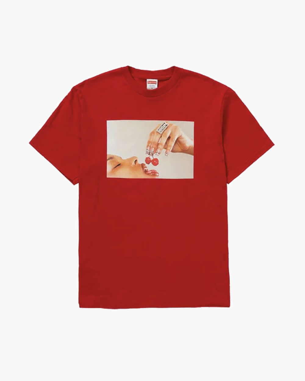 Supreme released an assortment of more than ten different tees as a part of their SS20 Week One release. The Supreme Cherries Tee features an image crop of a woman seductively eating cherries. The tee was released in nine colors.